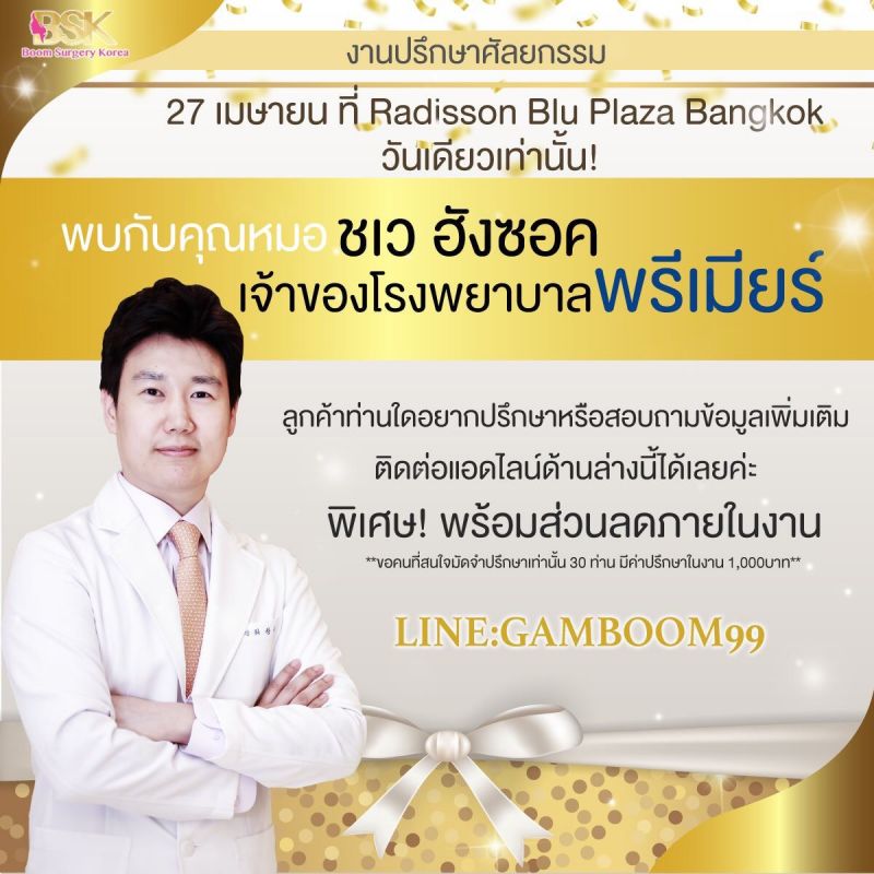 ปีนี้ใครหน้าพัง หน้ายังไม่ปัง ห้ามพลาด! กับการคัมแบล็คกันอีกครั้งในเดือนเมษายนนี้ กับ งานปรึกษาศัลยกรรมเกาหลี กับคุณหมอชเวฮังซอค โรงพยาบาลศัลยกรรมพรีเมียร์ (Premier Plastic Surgery Hospital) ที่ถูกพูดถึงมากที่สุดในบรรดากลุ่มชาวต่างชาติ และเหล่าคนดังในวงการบันเทิงเกาหลี และวงการบันเทิงไทย อาทิ นางเอกวิกหมอชิต “เนย ปภาดา” นอกจากนี้กับข่าวที่ฮือฮาที่สุดในวงการศัลยกรรม คือการเปลี่ยนไซส์หน้าอกของนักร้องลูกทุ่งตัวแม่ “จ๊ะ นงผณี (จ๊ะ อาร์สยาม)” ที่ผ่าตัดภายในเวลา 3 ชั่วโมง เธอก็สามารถลุกขึ้นเดินได้อย่างสบายๆ กับเอเจนซี่ศัลยกรรมอันดับหนึ่งของประเทศไทยอย่าง “บีเอสเค (Boom Surgery Korea)” เอเจนซี่ศัลยกรรมเกาหลีที่มีใบรับรองการทำงานอย่างถูกต้องตามกฎหมาย จากกระทรวงสาธารณสุขของประเทศเกาหลี