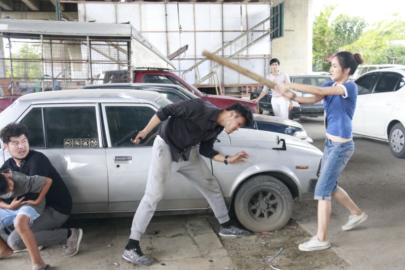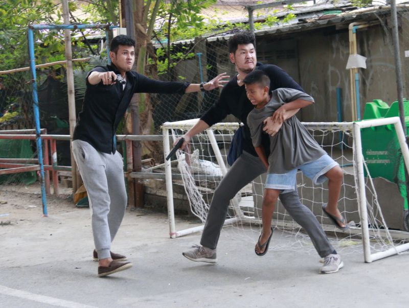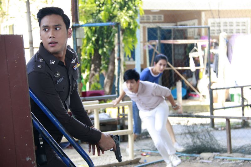เป็นฉากที่ ผู้กองคำรบ (บอส-พุทธิพงษ์) ชวน หมอวงศกร (ตูมตาม) มารักษาคนในชุมชนฟรี แต่อยู่ๆ กลับเจอคนร้ายหนีตำรวจมาจับเด็กเป็นตัวประกัน เบอะ (แซนดี้) เห็นเหตุการณ์เข้า ก็อยากช่วยผู้กองคำรบ จังหวะที่เบอะจะเอาไม้ฟาดหัวคนร้าย หมอวงศกรเตะโกนเรียกเบอะ คนร้ายหันมาเห็น เลยเอาด้ามปืนตีเข้าที่หัวแซนดี้จนแตก หมอวงศกรรีบเข้ามาช่วย สู้กับโจรจนฝุ่นตลบ