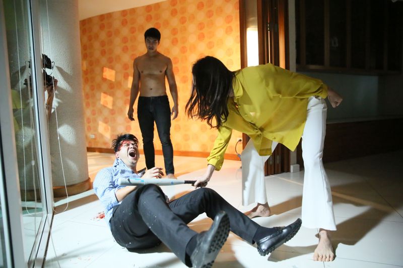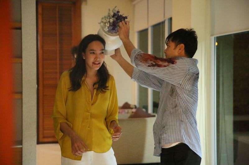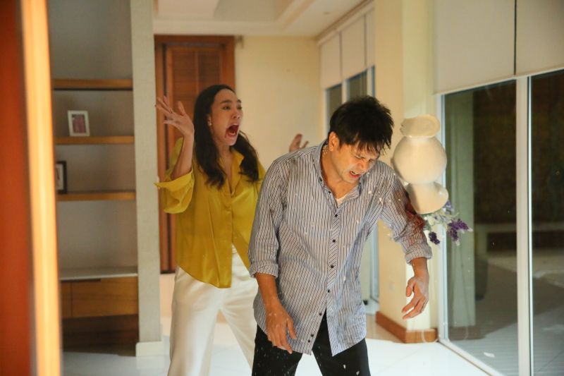 ผู้กำกับ โอ๋ คฑาเทพก็ให้ตุ๊ก กับ เต๋ามาซักซ้อมคิวกันก่อน เพื่อความแม่นยำในการปะทะกัน เพราะทั้งคู่ต้องตบตีลงไม้ลงมือกันอย่างหนักซึ่งในฉากตุ๊กจะต้องเอาแจกันฟาดหัวเต๋าจากด้านหลัง เต๋าก็ช่วยทำให้ตุ๊กดูเป็นตัวอย่างว่าจะต้องฟาดลงตรงไหนเพราะจะได้ตั้งรับให้พอดีทั้งคู่ซักซ้อมกันซักพักจนเข้าใจและรู้จังหวะกันแล้วก็เริ่มถ่ายจริงเริ่มที่เต๋าเดินขโยกเขยก เนื้อตัวมอมแมมเลอะไปด้วยเลือด ค่อยๆ เปิดประตูบ้านเข้าบ้าน พอตุ๊กเห็นก็ตกใจมาก รีบไล่เต๋ากลับไป แต่เต๋าไม่ยอม ตุ๊กเลยดันตัวเต๋าออก จังหวะนี้ก็มีผู้ชายเดินออกมาหาตุ๊กพอดี พอเต๋าเห็นเข้าก็โกรธมากตบตุ๊กหน้าหัน และพุ่งเข้าชกหน้าชายชู้ ตุ๊กรีบเข้าไปห้าม แต่ไม่ทัน พอเต๋าเผลอ ตุ๊กก็คว้าแจกันฟาดลงไปที่ท้ายทอยเต๋าจนล้มลงไปกองกับพื้น เต๋าพยายามลุกขึ้นจะสู้กับตุ๊ก แต่ตุ๊กคว้าไม้เบสบอลฟาดซ้ำไปที่ลำตัว ขา และท้อง จนเต๋าดิ้นทุรนทุราย ตุ๊กยืนมองเต๋าหมดสติไป ด้วยความสะใจผู้กำกับสั่งคัท ตุ๊กรีบเข้าไปพยุงเต๋าลุกขึ้นด้วยความเป็นห่วง ซึ่งเต๋าก็บอกว่า “แค่นี้จิ๊บๆ ขอน้ำแดงแก้วใหญ่ จิบด้วย” เล่นเอาฮากันทั้งกอง…