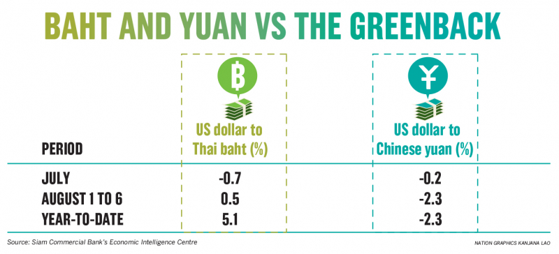 Research by the Siam Commercial Bank’s Economic Intelligence Centre shows that the baht has risen 5.1 per cent against the dollar since January 1, while the yuan has dropped 2.3 per cent.