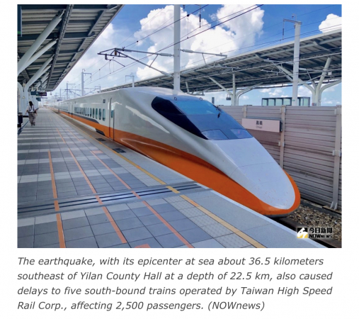 The earthquake, with its epicenter at sea about 36.5 kilometers southeast of Yilan County Hall at a depth of 22.5 km, also caused delays to five south-bound trains operated by Taiwan High Speed Rail Corp., affecting 2,500 passengers.