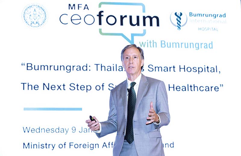 ประเทศไทย ถือเป็นหนึ่งในจุดหมายปลายทางสำคัญของนักท่องเที่ยวทั่วโลก และเป็นจุดหมายของการท่องเที่ยวเชิงสุขภาพ โดยสื่อจากสำนักข่าวต่างประเทศมากมายได้ตีพิมพ์บทความการจัดอันดับประเทศที่มีประสิทธิภาพในด้าน Healthcare ซึ่งไทยอยู่ในลำดับที่ 14 ของโลกและยังถือเป็นธุรกิจที่กำลังเติบโตอย่างรวดเร็ว มร.เดวิด โธมัส บูเช ผู้อำนวยการด้านบิสซิเนสทรานส์ฟอร์มเมชั่น (Chief Business Transformation Officer) โรงพยาบาลบำรุงราษฎร์ ได้กล่าวในงานสัมมนา “MFA CEO Forum with Bumrungrad” หัวข้อ “Thailand’s Smart Hospital: The Next Step of Sustainable Healthcare” จัดโดย กรมเศรษฐกิจระหว่างประเทศ กระทรวงการต่างประเทศ เพื่อแสดงวิสัยทัศน์ด้าน Smart Hospital และเพื่อยกระดับบทบาทของเอกชนไทยในเวทีเศรษฐกิจโลก โดยมีเอกอัครราชทูตต่างประเทศที่ประจำการในประเทศไทย ตลอดจนผู้บริหารในภาคธุรกิจชั้นนำเข้าร่วม