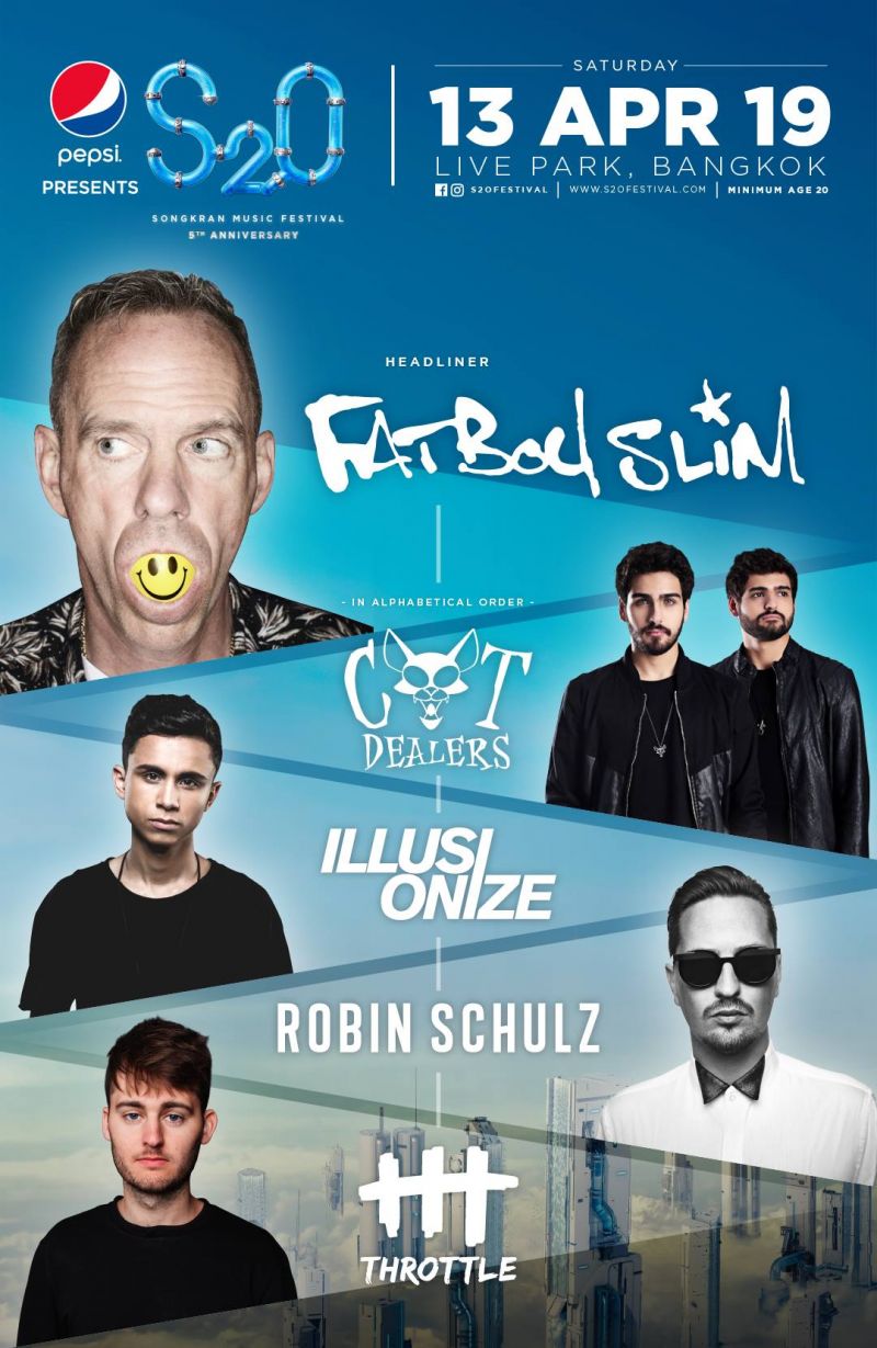พบกับ FAT BOY SLIM ดีเจตัวพ่อรุ่นใหญ่ชื่อดังระดับโลก ที่เตรียมขนเพลงฮิตมาให้สนุกกันมากมาย ไม่ว่าจะเป็น Right Here, Right Now, Gangster Trippin, Bird Of Prey และ Weapon Of Choice เป็นต้น พร้อมด้วย CAT DEALERS , ILLUSIONIZE , ROBIN SCHULZ และ THROTTLE