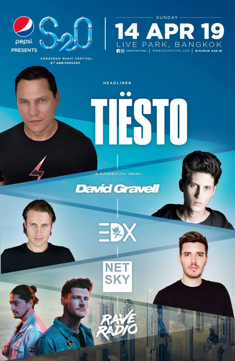 เรียกได้ว่าไม่มีใครไม่รู้จัก TIESTO ดีเจชาวดัตช์ โปรดิวเซอร์เพลงคนดัง สุดยอดเจ้าพ่อเพลง Trance ที่คนไทยรู้จักกันดี พร้อมขนเพลงมาระเบิดความมันส์ให้ชาว S2O ได้สนุกไปด้วยกัน และพบกับ DAVID GRAVELL , EDX , NETSKY , RAVE RADIO