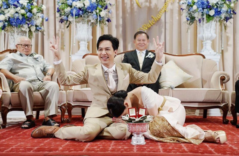 หลังจากทำพิธีทางสงฆ์เสร็จเรียบร้อย ช่วงเวลา 09.00 น. ก็ถึงช่วงพิธีสำคัญการสู่ขออย่างเป็นทางการและการสวมแหวนหมั้น สำหรับสินสอดประกอบไปด้วย เช็คเงินสด, เงินสด, เครื่องเพชร, แหวนเพชร ซึ่งทุกอย่างจัดขึ้นอย่างเรียบง่ายไม่มีการแห่ขันหมากใดๆ และช่วงเย็นจะเป็นงานเลี้ยงมงคลสมรส