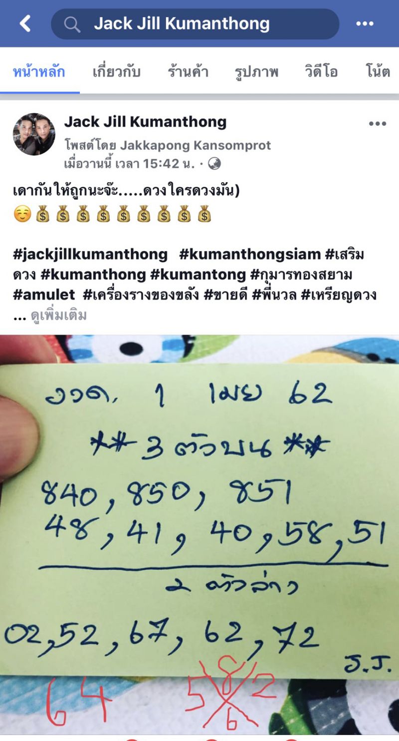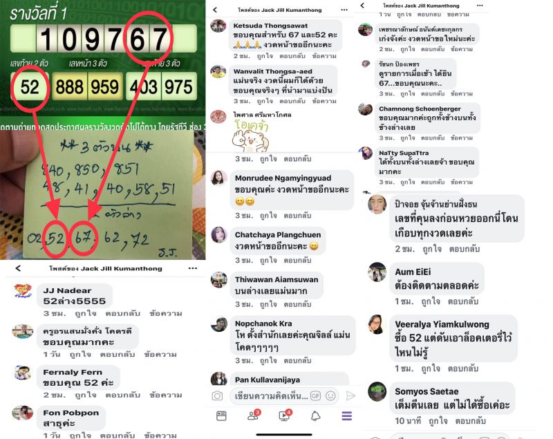 “จริงๆ แล้วก็ค่อนข้างถูกบ่อยนะครับ อย่าง 10 งวดที่ผ่านมาก็ถูกไป 9 งวดแต่ไม่ค่อยบอกใคร ที่จะรู้กันก็คือคนที่ติดตามเฟซบุค jackjillkumanthongซึ่งเราจะลงเกี่ยวกุมารทองและเครื่องรางของขลังที่เราสะสม คนก็จะชอบเข้ามาถามว่า มีของขลังมากมายขนาดนี้ มีของดีมากขนาดนี้ต้องได้อะไรเด็ดๆ แน่นอน แต่ละงวดก็มาถามแล้วว่า งวดนี้เลขอะไร เราก็มีลงบอกไป อย่างล่าสุดก็พึ่งโพสต์ลงไปเมื่อวันที่ 31 มีนาคมที่ผ่านมา พอเช้ามาก็มาออกรายการที่ช่อง 9 ซึ่งตรงกับวันหวยออกพอดี ก็เลยได้คุยเรื่องนี้ในรายการ แล้วปรากฏว่าคนดูรายการก็พากันไปซื้อถูกกันสนั่น โทรเข้ามาขอบคุณที่ร้านกันสายแทบไหม้ ในเฟซบุคก็มาบอกว่าถูกกัน”