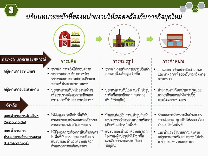 ยกตัวอย่างโครงการสานพลังประชารัฐเพื่อสนับสนุนการปลูกข้าวโพดเลี้ยงสัตว์หลังฤดูทำนาที่ผ่านประสบความสำเร็จเพราะกระทรวงเกษตรฯได้ประสานทั้งกระทรวงพาณิชย์ และสมาคมผู้ประกอบการอาหารสัตว์เพื่อขอทราบข้อมูลความต้องการข้าวโพดอาหารสัตว์ก่อนแล้วให้สหกรณ์การเกษตรแต่ละแห่งทำข้อตกลงล่วงหน้ากับชาวนาว่าจะมาซื้อข้าวโพดแล้วจึงให้ชาวนาลงมือปลูก ผลปรากฎว่ามีชาวนาเข้าร่วมโครงการ78,000ครอบครัวคืดเป็นพื้นที่ปลูกข้าวโพดแทนการทำนาปรับ800,000ไร่ขณะนี้เก็บเกี่ยวข้าวโพดขายได้เกือบสิ้นสุดโครงการแล้วชาวนาได้กำไรไร่3,000บาท