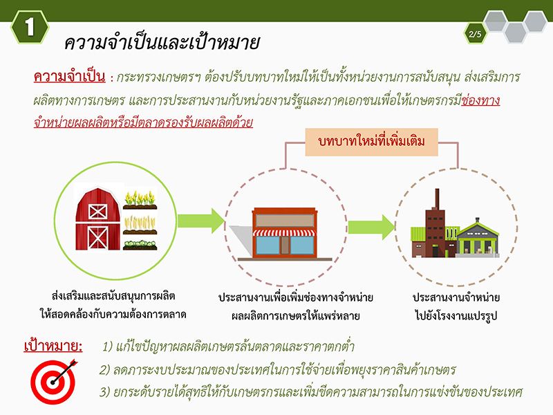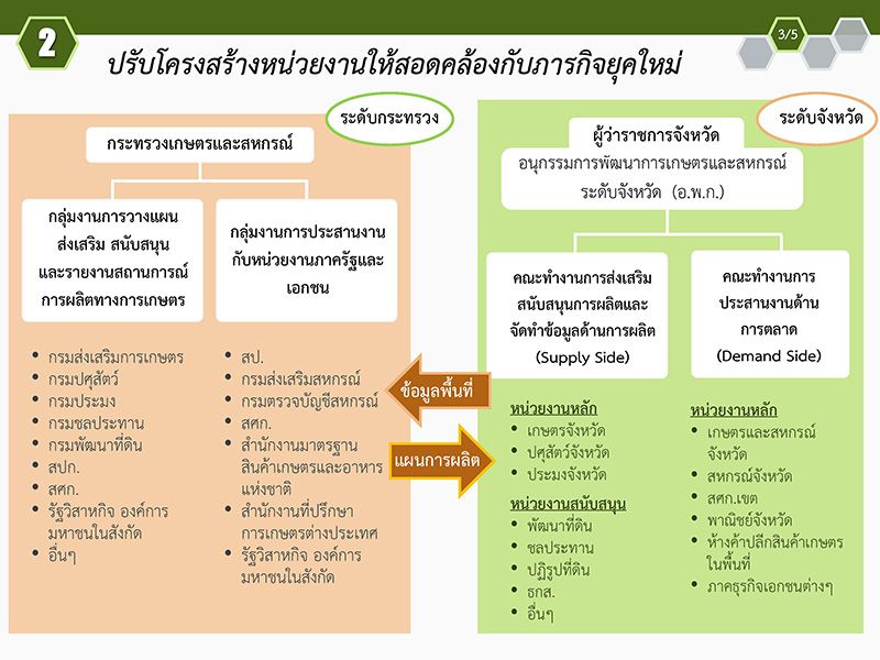 ยกตัวอย่างโครงการสานพลังประชารัฐเพื่อสนับสนุนการปลูกข้าวโพดเลี้ยงสัตว์หลังฤดูทำนาที่ผ่านประสบความสำเร็จเพราะกระทรวงเกษตรฯได้ประสานทั้งกระทรวงพาณิชย์ และสมาคมผู้ประกอบการอาหารสัตว์เพื่อขอทราบข้อมูลความต้องการข้าวโพดอาหารสัตว์ก่อนแล้วให้สหกรณ์การเกษตรแต่ละแห่งทำข้อตกลงล่วงหน้ากับชาวนาว่าจะมาซื้อข้าวโพดแล้วจึงให้ชาวนาลงมือปลูก ผลปรากฎว่ามีชาวนาเข้าร่วมโครงการ78,000ครอบครัวคืดเป็นพื้นที่ปลูกข้าวโพดแทนการทำนาปรับ800,000ไร่ขณะนี้เก็บเกี่ยวข้าวโพดขายได้เกือบสิ้นสุดโครงการแล้วชาวนาได้กำไรไร่3,000บาท