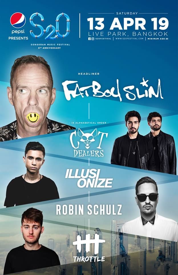 Pepsi Presents S2O Songkran Music Festival 2019 สงกรานต์มิวสิคเฟสติวัลอันดับหนึ่งที่คนทั่วโลกรอคอยและอยากมาพิสูจน์ความมันส์มากที่สุดฉลอง 5 ปีสุดยิ่งใหญ่ พร้อมเปิดโผเวลาแห่งความมันส์ จัดเต็มกับบรรดาที่สุดของดีเจระดับโลก ที่ไลน์อัพอิมพอร์ตเรียงหน้ากันมาสร้างความสนุก ระเบิดความมันส์กันแบบนันสต๊อปไปกับเสียงเพลง และดนตรีกันให้สุดเหวี่ยง