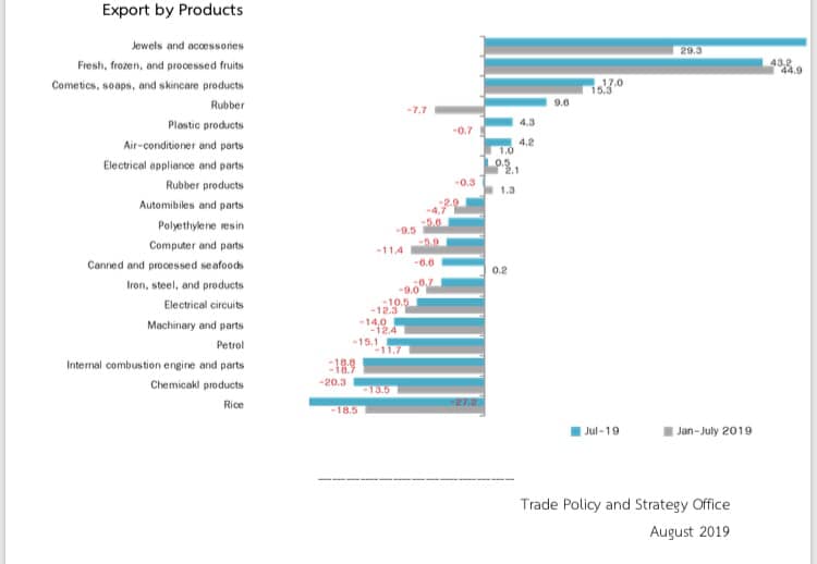 In contrast, industrial products remained positive for a second consecutive month. Top performers are gold (+406.9%), cosmetics, soaps, and skincare products (+17.0 per cent), and air-conditioners (+4.2 per cent). However, some industrial products decreased, for example, oil-related products (-14.2 per cent), computer and parts (-5.9%), automobiles and parts (-2.9 per cent). In the first seven months of 2019, industrial products contracted 1.4 percent.