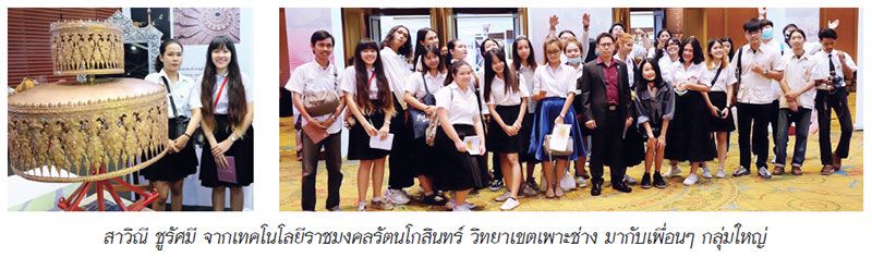 สาวิณี ชูรัศมี นักศึกษาจากเทคโนโลยีราชมงคลรัตนโกสินทร์ วิทยาเขตเพาะช่างกล่าวว่า “มากับเพื่อนๆ กลุ่มใหญ่ งานนี้ได้รวบรวมบุคลากรงานฝีมือเชิงช่างของไทยไว้มากที่สุด ทั้งครูช่างศิลป์ของแผ่นดิน ครูช่างศิลปหัตถกรรม และทายาทช่างศิลหัตถกรรม จึงเป็นโอกาสดีที่เยาวชนคนรุ่นใหม่จะได้เข้ามาพูดคุย ศึกษาและเรียนรู้เรื่องงานช่าง โดยเฉพาะงานที่มีค่า ทำยาก ต้องใช้ความชำนาญอย่างมากเช่น พวกงานโลหะ สลักดุน งานถมต่างๆอยากมาเรียนรู้เรื่องงานดีไซน์ งานอาร์ตที่นำมาประยุกต์ในชิ้นงาน และมาพูดคุยกับครู เกิดแรงบันดาลใจใหม่ๆ ให้กับตนเอง ซึ่งบรรดาครูและทายาทต่างให้ความเป็นกันเอง ตอบข้อซักถาม บางท่านก็ให้ได้ทดลองทำเองจริงๆ สนุกสนานและได้ความรู้มากเลยค่ะ” ด้าน น้องไอซ์-บัณฑิตา พลการ พร้อมเพื่อนๆ เยาวชนจากโรงเรียนสาธิตมหาวิทยาลัยรามคำแหง เล่าว่า “ดีใจมากๆ ที่ได้พบกับครูดังๆ หลายท่าน ได้ถ่ายทอดความรู้ แนวคิดในการสร้างสรรค์ผลงานอย่างเป็นกันเอง โดยเฉพาะครูพิรุณ เล่าประวัติที่มาของหุ่นกระบอกไทย ได้รู้ว่าหุ่นกระบอกมีความเป็นมาผูกพันกับวิถีไทยตั้งแต่ชาวบ้านไปจนถึงในรั้วในวัง ได้รู้ถึงวิธีการทำตัวหุ่น เสื้อผ้าอาภรณ์ เครื่องประดับ และการประกอบ ยิ่งได้รู้ว่าบรรพบุรุษเรามีฝีมือมากขนาดนี้ ก็ยิ่งภูมิใจ ชื่นใจในความเป็นไทย เป็นโอกาสดีที่ได้ลองเชิดหุ่นอีกด้วย ครูชมว่ามีแววยิ่งอยากศึกษาลึกซึ้ง วันนี้จึงสนุกสนานและได้ความรู้กลับไปมากมาย และตั้งใจจะนำเรื่องราวด้านศิลปหัตถกรรมไทยไปบอกต่อเพื่อนๆ และอาจารย์ได้รับรู้ด้วยค่ะ” ปิดท้ายที่แฟนพันธุ์แท้รุ่นจิ๋ว ด.ญ.เบญจ์สิริ โกษีอำนวย หรือ น้องอินดี้ อายุ 4 ขวบ จากโรงเรียนอนุบาลบ้านสานฝัน มากับคุณแม่เบญจมาศ เล่าว่า “ที่โรงเรียนน้องสอนเรื่องการแต่งกายในภาคต่างๆ ของไทยเลยพาน้องมาชมงาน มาเรียนรู้เรื่องผ้า และงานศิลปหัตถกรรมไทยอื่นๆ สิ่งเหล่านี้ต้องปลูกฝังตั้งแต่เด็ก เพื่อให้เกิดความรัก ความภาคภูมิใจในอัตลักษณ์ความเป็นไทยของเรา เพราะเด็กรุ่นใหม่จะเป็นกำลังสำคัญในการสืบสานและส่งต่อในอนาคตค่ะ” ส่วนน้องอินดี้เล่าทิ้งท้ายว่าวันนี้สนุกมาก ได้เห็นผ้าสวยๆ และของสวยๆ เต็มไปหมด และหนูก็ชอบแต่งชุดไทยมากค่ะ”