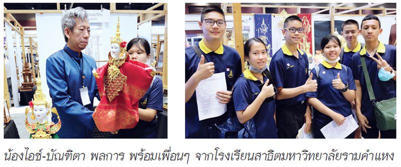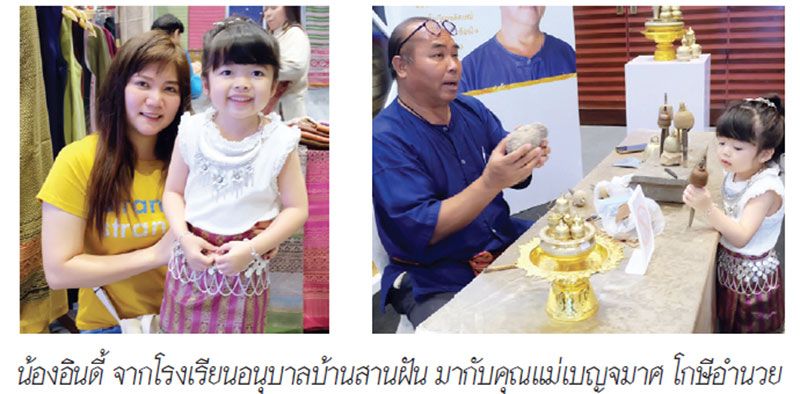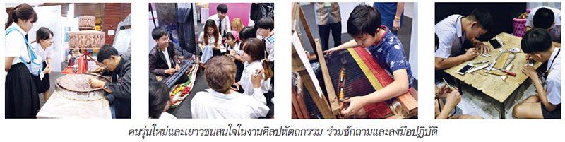 สาวิณี ชูรัศมี นักศึกษาจากเทคโนโลยีราชมงคลรัตนโกสินทร์ วิทยาเขตเพาะช่างกล่าวว่า “มากับเพื่อนๆ กลุ่มใหญ่ งานนี้ได้รวบรวมบุคลากรงานฝีมือเชิงช่างของไทยไว้มากที่สุด ทั้งครูช่างศิลป์ของแผ่นดิน ครูช่างศิลปหัตถกรรม และทายาทช่างศิลหัตถกรรม จึงเป็นโอกาสดีที่เยาวชนคนรุ่นใหม่จะได้เข้ามาพูดคุย ศึกษาและเรียนรู้เรื่องงานช่าง โดยเฉพาะงานที่มีค่า ทำยาก ต้องใช้ความชำนาญอย่างมากเช่น พวกงานโลหะ สลักดุน งานถมต่างๆอยากมาเรียนรู้เรื่องงานดีไซน์ งานอาร์ตที่นำมาประยุกต์ในชิ้นงาน และมาพูดคุยกับครู เกิดแรงบันดาลใจใหม่ๆ ให้กับตนเอง ซึ่งบรรดาครูและทายาทต่างให้ความเป็นกันเอง ตอบข้อซักถาม บางท่านก็ให้ได้ทดลองทำเองจริงๆ สนุกสนานและได้ความรู้มากเลยค่ะ” ด้าน น้องไอซ์-บัณฑิตา พลการ พร้อมเพื่อนๆ เยาวชนจากโรงเรียนสาธิตมหาวิทยาลัยรามคำแหง เล่าว่า “ดีใจมากๆ ที่ได้พบกับครูดังๆ หลายท่าน ได้ถ่ายทอดความรู้ แนวคิดในการสร้างสรรค์ผลงานอย่างเป็นกันเอง โดยเฉพาะครูพิรุณ เล่าประวัติที่มาของหุ่นกระบอกไทย ได้รู้ว่าหุ่นกระบอกมีความเป็นมาผูกพันกับวิถีไทยตั้งแต่ชาวบ้านไปจนถึงในรั้วในวัง ได้รู้ถึงวิธีการทำตัวหุ่น เสื้อผ้าอาภรณ์ เครื่องประดับ และการประกอบ ยิ่งได้รู้ว่าบรรพบุรุษเรามีฝีมือมากขนาดนี้ ก็ยิ่งภูมิใจ ชื่นใจในความเป็นไทย เป็นโอกาสดีที่ได้ลองเชิดหุ่นอีกด้วย ครูชมว่ามีแววยิ่งอยากศึกษาลึกซึ้ง วันนี้จึงสนุกสนานและได้ความรู้กลับไปมากมาย และตั้งใจจะนำเรื่องราวด้านศิลปหัตถกรรมไทยไปบอกต่อเพื่อนๆ และอาจารย์ได้รับรู้ด้วยค่ะ” ปิดท้ายที่แฟนพันธุ์แท้รุ่นจิ๋ว ด.ญ.เบญจ์สิริ โกษีอำนวย หรือ น้องอินดี้ อายุ 4 ขวบ จากโรงเรียนอนุบาลบ้านสานฝัน มากับคุณแม่เบญจมาศ เล่าว่า “ที่โรงเรียนน้องสอนเรื่องการแต่งกายในภาคต่างๆ ของไทยเลยพาน้องมาชมงาน มาเรียนรู้เรื่องผ้า และงานศิลปหัตถกรรมไทยอื่นๆ สิ่งเหล่านี้ต้องปลูกฝังตั้งแต่เด็ก เพื่อให้เกิดความรัก ความภาคภูมิใจในอัตลักษณ์ความเป็นไทยของเรา เพราะเด็กรุ่นใหม่จะเป็นกำลังสำคัญในการสืบสานและส่งต่อในอนาคตค่ะ” ส่วนน้องอินดี้เล่าทิ้งท้ายว่าวันนี้สนุกมาก ได้เห็นผ้าสวยๆ และของสวยๆ เต็มไปหมด และหนูก็ชอบแต่งชุดไทยมากค่ะ”