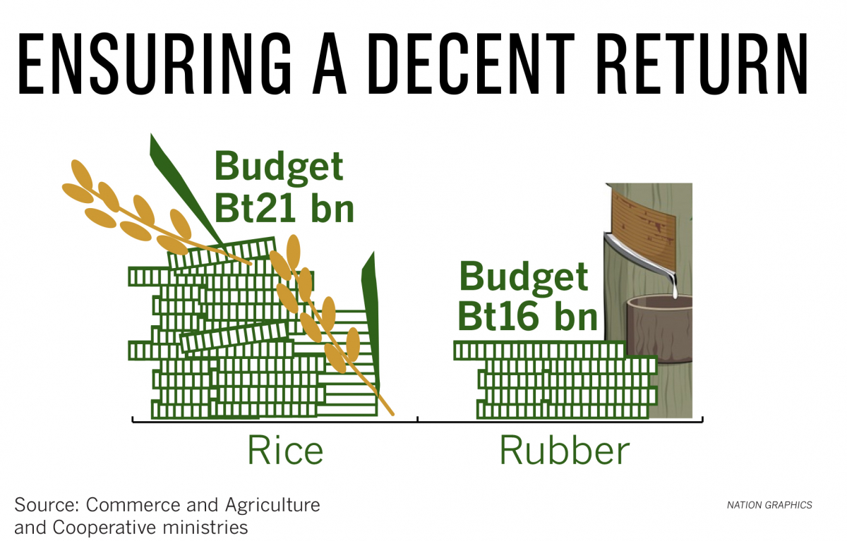 The government has also earmarked Bt16 billion for rubber with a price guarantee of Bt60 per kilogramme, and 18-per-cent palm oil has been guaranteed at Bt4 per kilo.