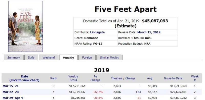 “FIVE FEET APART” ติดท็อป 5 บ็อกซ์ออฟฟิศอเมริกา 3 สัปดาห์ซ้อน