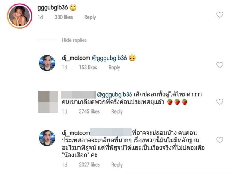 เป็นเรื่องราวดราม่าขึ้นมาทันที! หลังนักแสดงสาว “กุ๊บกิ๊บ สุมณฑิพย์” เข้าไปคอมเม้นท์ในไอจีเพื่อนสนิท “ดีเจมะตูม เตชินท์” เป็นภาพอีโมติค่อนรูปกลอกตามองบน ในช่วงเวลาที่มีกระแสข่าวดราม่าระหว่าง “ดีเจมะตูม” กับนางเอกสาว “ปู ไปรยา” ทำเอาแฟนๆ สงสัยและจับโยงไปว่าสาวกุ๊บกิ๊บ เข้ามาคอมเม้นท์แบบนั้นตั้งใจจะสื่อถึงสาวปู หรือเปล่า? ล่าสุดสาวกุ๊บกิ๊บ ได้ออกมาชี้แจงแบบเรื่องผ่านสื่อแบบชัดๆ แล้ว