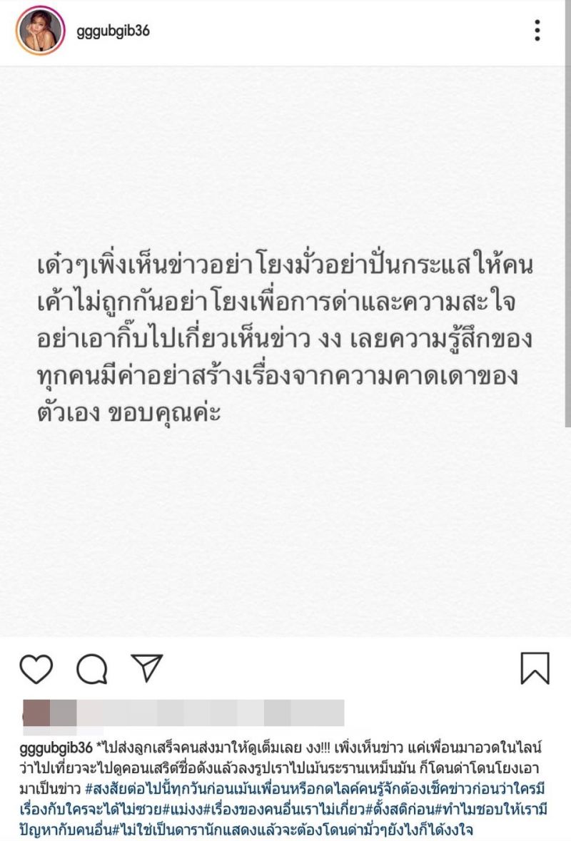 “กิ๊บชอบไปกัดเพื่อน เวลาเพื่อนกิ๊บไปเที่ยวเมืองนอก แล้วเราอยู่เมืองไทย เวลาเพื่อนเราไปเที่ยวกัน มันจะมีความหมั่น แล้วนางเหมือนมาคอมเม้นท์ว่าจะไปดูคอนเสิร์ตวงหนึ่งซึ่งดังมาก และเที่ยว แล้วก็โพสต์ เราเลยไปคอมเม้นท์ตามเขา เราเลยไม่ได้รู้ว่าเกิดอะไรขึ้น คือกิ๊บชี้แจงไปแล้ว คนจะเข้าใจก็เข้าใจ ไม่เข้าใจอยากด่า ถ้ามีความสุขก็ตามใจ เราก็ไม่ได้ว่าอะไร ที่เราเขียนกิ๊บไม่ได้แคร์ใครเลย กิ๊บแคร์แค่คนในจะเข้าใจกัน กิ๊บแคร์แค่ปู ว่าปูจะเข้าใจ แล้วน้องก็เข้าใจ”