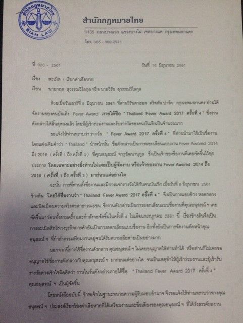 กลายเป็นประเด็นฮอตขึ้นมาชั่วข้ามคืนเลยทีเดียว และลุกลามมาตั้งแต่ช่วงกลางปีที่แล้วแล้วสำหรับการประกาศรางวัลฟีเวอร์อวอร์ด ที่ล่าสุดกำลังจะจัดขึ้นอีกครั้งในวันเสาร์ที่ 27 เมษายนนี้โดยน่าจะเรียกรอบนี้เป็นครั้งที่ 5 ที่ใช้ชื่อในการจัดงานว่า ไทยแลนด์ฟีเวอร์อวอร์ด 2018 แต่ทว่าเจ้าของลิขสิทธิ์ตัวจริงของเวทีฟีเวอร์อวอร์ดนี้กลับงงเป็นไก่ตาแตก เพราะไม่ได้เป็นคนจัดงานนี้ ทำเอาวุ่นกันไปทั้งวงการว่าใครกันที่ผุดงาน “ไทยแลนด์ฟีเวอร์อวอร์ด”ในครั้งนี้ขึ้นมา