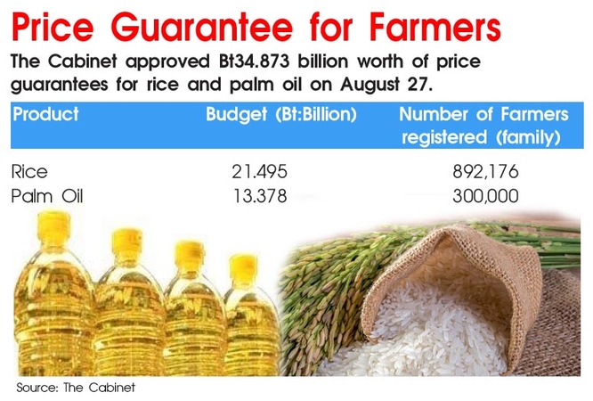 • Paddy rice grown at 15 per cent humidity, priced at Bt10,000 per tonne with an income guarantee for not more than 30 tonnes per household or not more than 40 rai