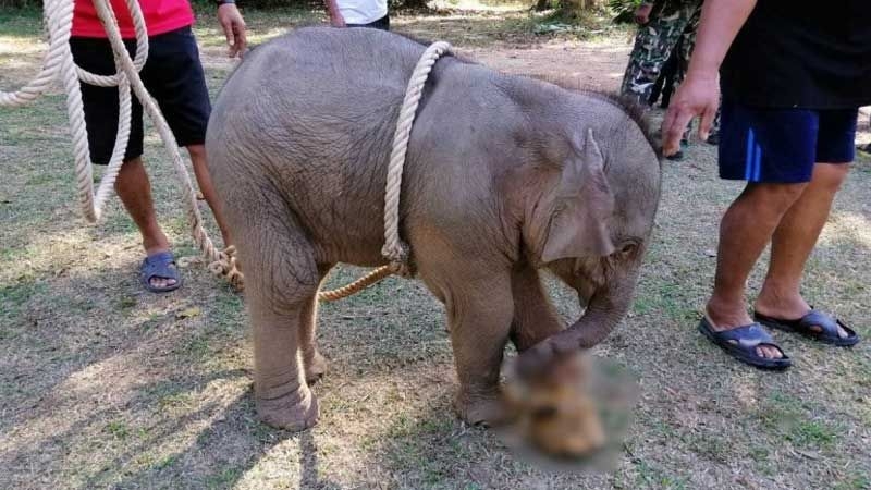 The baby elephant was found trapped in an abandoned cesspool in a rubber plantation in Ban None Phaisan village in Tambon Khok Kwang in Bung Kla district on April 4. It suffered injuries to its back and tummy.
