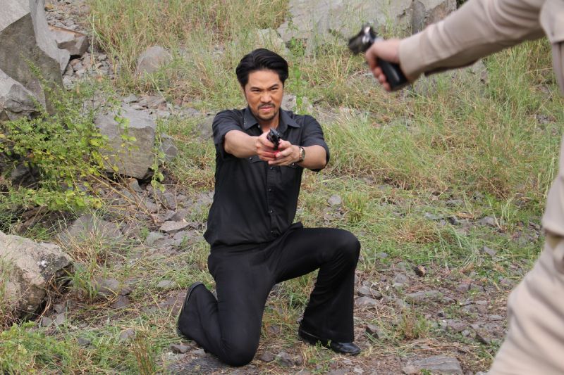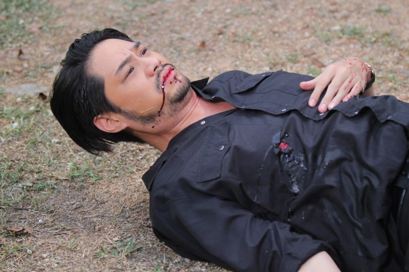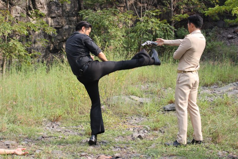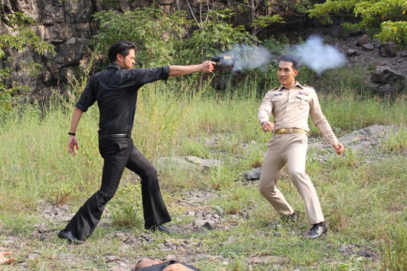 ฉากนี้เป็นตอนที่เสี่ยภุชงค์(เตอร์-ปริยะ)บุกยิงหิน(บิ๊กเอ็ม-กฤตฤทธิ์)ที่หน้าอำเภอ หินออกตามล่าจนเจอตัว เสี่ยภุชงค์โผล่มาพร้อมกับลูกสมุน ดาหน้าเข้ามายิงหิน หินใช้ทักษะยิงต่อสู้ จนลูกสมุนเสี่ยตายเรียบ เหลือกันตัวต่อตัว ทั้งสองคนแลกหมัดกัน ทั้งเตะ ต่อย ผลัดกันรับผลัดกันรุก ปืนของทั้งคู่หลุดมือ ต่างก็วิ่งเข้าไปคว้าแต่หินเร็วกว่า ยิงเข้าใส่เสี่ยภุชงค์ทันที จนตายคาที่