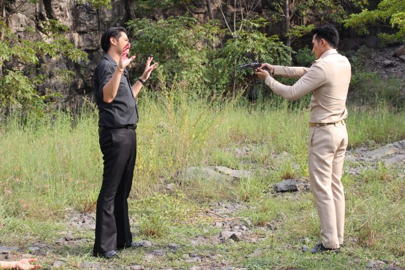 เบื้องหลังฉากนี้ยกกองไปถ่ายทำกันที่หน้าผาไทร็อค จังหวัดสระบุรี ท่านอากาศอากาศและแสงแดดที่ร้อนอบอ้าว ทั้งบิ๊กเอ็มและเตอร์ แต่ก็เป็นผู้ชายที่เหงื่อเยอะมาก ไหลออกมาไม่หยุดหย่อน แต่ด้วยสปิริตทั้งสองหนุ่มก็ซ้อมคิวบู๊และคิวเอฟเฟ็ค เพื่อป้องกันการพลาดคิว ระหว่างตอนซ้อมก็เข้มข้น ทั้งสองหนุ่มก็เตะ ต่อย แลกหมัดกันอย่างเมามันส์ ผลัดกันรับผลัดกันรุก ท่ามกลางความร้อนระอุ ก็ไม่มีถอย หลังจากที่ซ้อมจนมั่นใจแล้วก็ถึงเวลาถ่ายทำจริงๆ ทีมงานก็รีบเข้ามาซับหน้าซับตา ก่อนที่พี่แดง บูรพา ผู้กำกับจะสั่งเดินกล้องถ่ายทำ เตอร์พาลูกสมุนบุกไปยิงบิ๊กเอ็มกันถึงหน้าอำเภอเพื่อปิดบัญชีแค้น แต่บิ๊กเอ็มดันหลบได้เลยเกิดการต่อสู้ยิงใส่กัน แล้วก็ออกตามล่าจนไปจนมุมกันที่ลานหิน เตอร์โผล่มาพร้อมลูกสมุนแบบจัดเต็ม บิ๊กเอ็มสังเกตท่าทีแล้วก็ค่อยๆสุ่มยิงลูกสมุนของเตอร์ ดับไปทีละคน จนเหลือเตอร์เพียงลำพัง คราวนี้บิ๊กเอ็มเลยโผล่ออกมาเผชิญกับเตอร์แบบตัวต่อตัว ทั้งสองจ้องกันเขม็งตาต่อตา ฟันต่อฟัน บิ๊กเอ็มเอาปืนขึ้นมาจ่อขู่ เตอร์แกล้งตบตาทำท่ายอมยกมือขึ้นค่อยๆเดินเข้ามาหาบิ๊กเอ็ม แล้วก็ใช้จังหวะเผลอยกเท้าขึ้นเตะปืนบิ๊กเอ็มจนหลุดมือ เตอร์ก็รีบควักปืนจากด้านหลังออกมายิงสวนใส่ บิ๊กเอ็มหลบได้ทัน ทั้งคู่เลยเปิดศึกเตะ ต่อยกัน จนกระเด็นล้มกันไม่เป็นท่า จังหวะที่ล้มทั้งสองคนก็ต่างคว้าเก็บปืนที่หล่น บิ๊กเอ็มคว้าได้เร็วกว่าก็รีบลั่นไกปืนใส่เตอร์ตรงกลางหน้าอกเตอร์ แต่ระยะห่างที่ยืนของทั้งสองคนอยู่ประชิดกันเกินไป ทำให้สเก็ดดินปืนไปโดนตามเนื้อตามตัวของเตอร์ ทำให้รู้สึกแสบร้อน แต่ด้วยสปิริตของเตอร์ก็พยายามกัดฟันเล่นให้จบ เปรี้ยวที่รอเข้าไปหาบิ๊กเอ็มก็ได้แต่ยืนอึ้งๆ จนทีมงานต้องสะกิดให้เข้าไปหาบิ๊กเอ็มโอบกอดด้วยความเป็นห่วง หลังจากสิ้นเสียงคัทบิ๊กเอ็ม เปรี้ยว และทีมงานต่างไปช่วยกันพยุงแล้วก็รีบนำเตอร์ไปโรงพยาบาลเพื่อทำแผล งานนี้ต้องยกนิ้วให้กับความแข็งแกร่งกับเตอร์ไปเต็มๆเลยจ้า รับรองว่าฉากจุดจบของเตอร์นั้นเหมือนจริงมากๆ ห้ามพลาดในละคร “เพลงรักเพลงปืน” ออกอากาศวันพุธ ที่ 8 พฤษภาคม 2562 เวลา 20.20 น. ทางช่อง 7 HD กด 35 (เสนอเป็นตอนจบ)