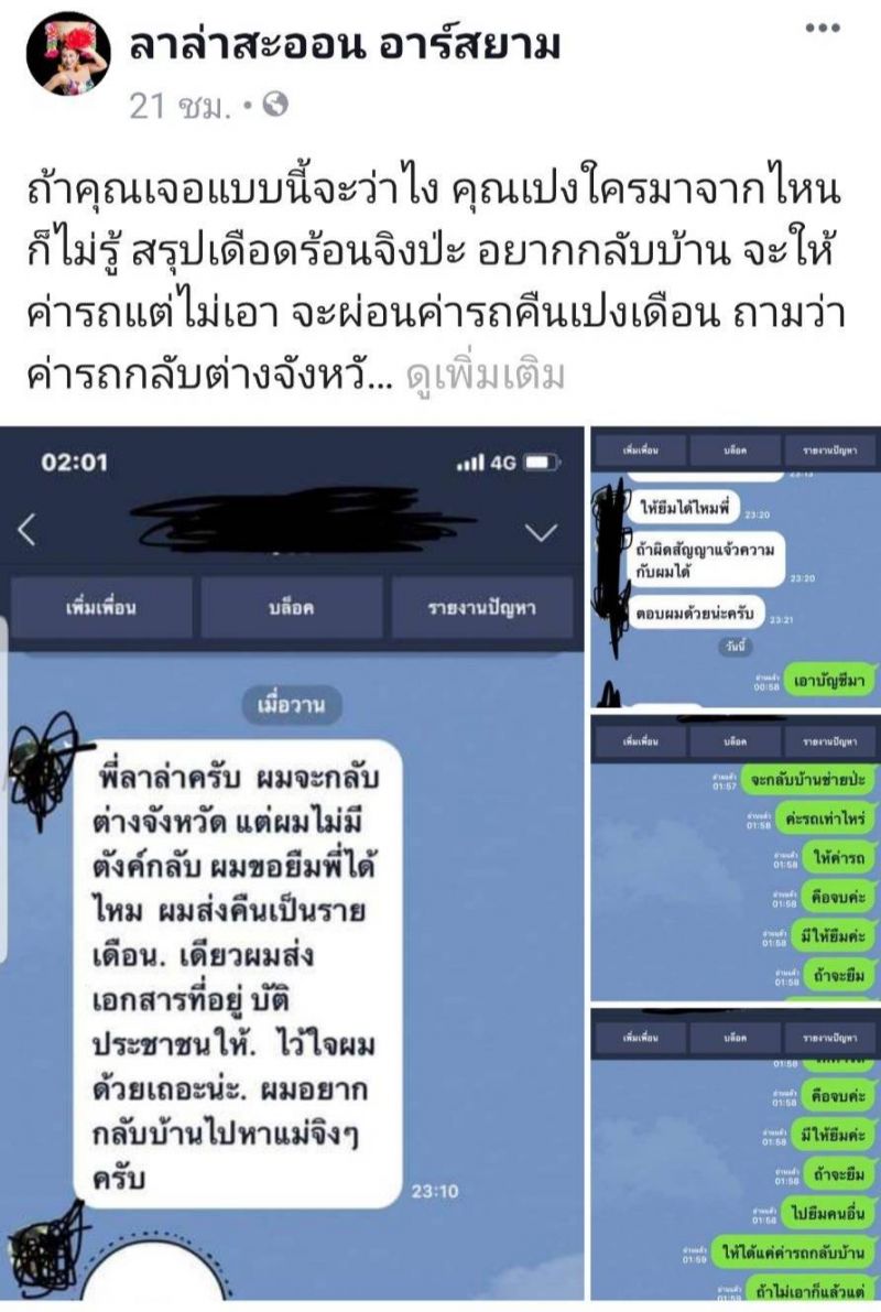 ทำเอานักร้องลูกทุ่งสาวอย่าง“ลาล่า อาร์สยาม” เจ้าของซิงเกิ้ล “ไผกะได้” ถึงกับงง เมื่อมีคนส่งขอความว่า “พี่ลาล่าครับ ผมจะกลับต่างจังหวัด แต่ผมไม่มีตังค์กลับ ผมขอยืมเงินพี่ได้ ผมส่งคืนเป็นรายเดือน เดี๋ยวผมส่งเอกสารที่อยู่ บัตรประชาชนให้ ไว้ใจผมด้วยเถอะนะ ผมอยากกลับบ้านไปหาแม่จริงๆ ครับ” งานนี้สาวลาล่าตอบกลับแบบสวยๆ “ค่ารถเท่าไหร่ ให้ค่ารถ คือจบค่ะ มีให้ยืมค่ะ ถ้าจะยืม”