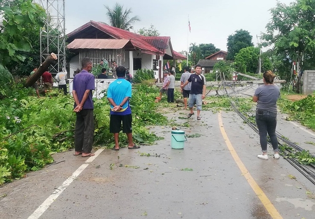 Sung Men’s tambon Nam Cham saw roofs blow off several houses, and trees fall down, pulling down five power poles along with them and resulting in an early morning blackout in Nam Cham and its adjacent tambon Pong Pa Lai. Meanwhile, Ban Phra Luang (Moo 5) in tambon Phra Luang saw a large teak tree fall and block a local road.