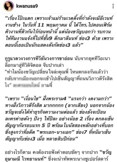 กลายเป็นประเด็นออกมาให้เคลียร์ สำหรับนางเอกสาว “ขวัญ อุษามณี” ที่ถูกปล่อยข่าวว่าเตรียมไปซบช่อง 3 เพราะได้รับข้อเสนอที่ดีกว่าที่อื่น โดยล่าสุดก่อนที่นางเอกสาวจะมีงานอีเว้นท์ในวันนี้ (11 พ.ค.) ขวัญ อุษามณี ก็ไม่ปล่อยให้เม้าท์กันนาน โดยออกมาขอชี้แจงแบบชัดๆ ผ่านไอจีส่วนตัว โดยเธอยืนยันว่าไม่เคยพูดอย่างที่เป็นข่าวแต่อย่างใด โดยมีแคปชั่นว่า “ไม่ต้องรอฟังถึงพรุ่งนี้นะคะ ขวัญบอกตรงนี้เลยสิ่งที่อยู่ในเนื้อข่าว ไม่มีคำใดๆ ที่ขวัญเป็นคนพูดกล่าวเลย !! สักคำ !! อย่าทำงานกันแบบนี้เลยค่ะ…”