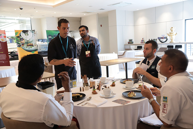 The winning team demonstrated the preparation of a Dilmah tea-based beverage called Chai Masala Iced Macchiato using 20 grams of Dilmah ceylon ginger tea, 10 grams of cinnamon, 5 grams of cardamom, 5 grams of star anise, 3 grams of cloves and 1 litre of milk. All ingredients were cooked in a sous-vide vacuum bag at 85 degree celsius for one hour to make 60 ml. of Masala Chai Tea, then mixed with 10 ml. of Dilmah almond extract tea in a glass and garnished with masala foam, cinnamon stick and dried orange.