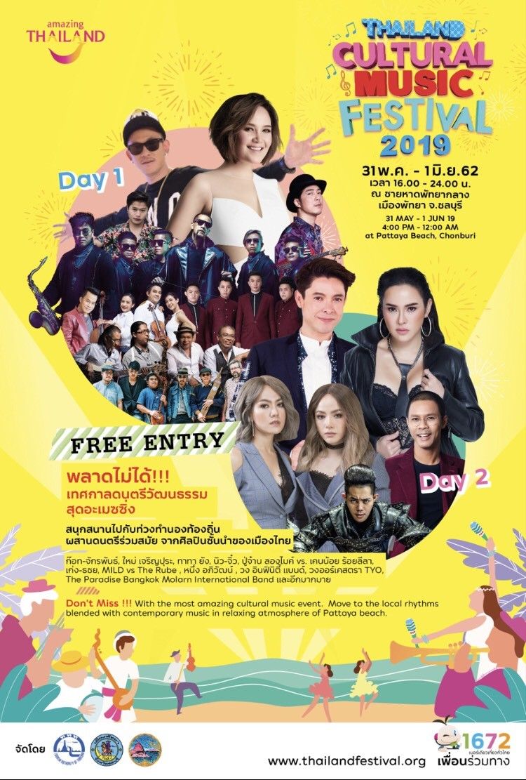 พลาดไม่ได้!!! Thailand Cultural Music Festival 2019 ในวันศุกร์ที่ 31 พฤษภาคม ถึงวันเสาร์ที่ 1 มิถุนายน 2562 ตั้งแต่เวลา 16.00 – 24.00 น ณ ชายหาดพัทยากลาง จ.ชลบุรี ชมฟรีตลอดงาน!!!!