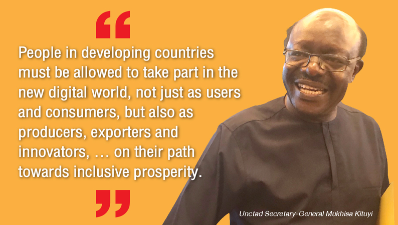 Unctad Secretary-General Mukhisa Kituyi said people in developing countries must be allowed “to take part in the new digital world, not just as users and consumers, but also as producers, exporters and innovators, … on their path towards inclusive prosperity”.