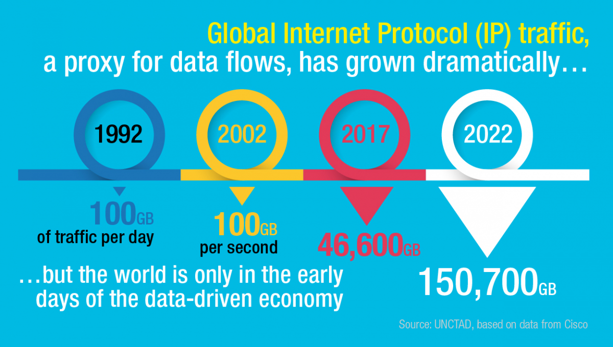Global internet protocol (IP) traffic has seen dramatic growth, the report says, from 100 gigabytes of traffic per day in 1992 to more than 45,000 per second in 2017. And yet the world is only in the early stages of the data-driven economy. By 2022, global IP traffic is projected to reach 150,700GB per second.