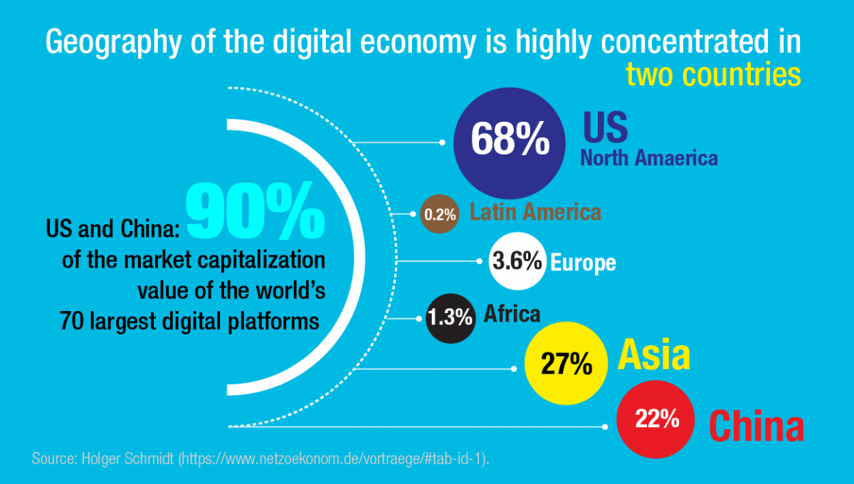 The dominance of global digital platforms and their control of data, as well as their capacity to create and capture the ensuing value, accentuates concentration and consolidation rather than reducing inequalities between and within countries, the report notes.