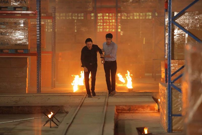 ฉากนี้เนรมิตโกดังเปล่าๆ ให้เป็นคลังเครื่องดื่มของตระกูลนาคพิทักษ์ ซึ่งเป็นฉากที่บอย และกบ-ทรงสิทธิ์ คู่พ่อลูกในเรื่อง ต้องเข้ามาเช็คสต๊อกที่คลังสินค้าเพราะได้รับข่าวเรื่องการทุจริตในบริษัท โดยที่อั้มตามมาเล่นงานอีกครั้ง จัดหนักด้วยการเผาโกดังคลังสินค้าให้วอดวายทำให้บอยและกบต้องวิ่งหนีกันหัวซุกหัวซุน ทั้งฝ่ากองไฟฝ่าควันเอฟเฟ็กต์ระเบิด จนเนื้อตัวเลอะเทอะไปตามๆ กัน และด้วยความที่มีเรื่องของเอฟเฟ็กต์เข้ามาเกี่ยวข้อง ทั้งทีมงานเอฟเฟ็กต์ และนักแสดงที่เข้าฉากก็ต้องซักซ้อมกันอย่างดี เรียกว่าต้องซักซ้อมทั้งคนที่ปล่อยเปลวไฟ และนักแสดงที่ต้องวิ่งผ่านเลยทีเดียวเพราะเป็นจังหวะที่บอย และกบต้องวิ่งหนีอั้ม ผ่านกองไฟที่พ่นตามไล่หลังมาตลอดทาง ซักซ้อมกันจนเป๊ะก็ถึงคราวถ่ายทำจริง ตามมาชมฉากเผาคลังสินค้าฉากนี้ ในละครเรื่อง “เพลิงนาคา” วันพฤหัสบดีที่ 30 พ.ค.นี้ เวลา 20.20 น. ทางช่อง 3
