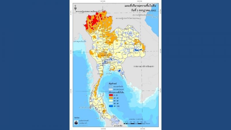 ทั้งนี้กรมป้องกันและบรรเทา สาธารณภัยได้ออกประกาศเขตพื้นที่ภัยแล้ง ยังคงมีจำนวน 5 จังหวัด (21 อำเภอ 89 ตำบล 750 หมู่บ้าน) ประกอบด้วย จ.เชียงราย ศรีสะเกษ มหาสารคาม ตราด และชลบุรี ขณะที่สถานการณ์น้ำในอ่างเก็บน้ำที่มีปริมาณน้ำน้อยกว่า 30% เป็นอ่างเก็บน้ำขนาดใหญ่ จำนวน 22 แห่ง อ่างเก็บน้ำขนาดกลาง 172 แห่ง ส่วนพื้นที่ประกาศเสี่ยง ฝนตกหนักถึงหนักมากจากกรมอุตุนิยมวิทยาคาดการณ์ว่าจะอยู่ที่บริเวณ ภาคเหนือตอนบน ภาคตะวันออกเฉียงเหนือ และภาคตะวันออก ในส่วนของแผนที่ปริมาณความชื้นในดินของกรมทรัพยากรน้ำ จะเห็นได้ว่าบริเวณพื้นที่ภาคเหนือ มีความชื้นในดินน้อยกว่าพื้นที่ภาคอื่นๆ โดยเฉพาะในพื้นที่ภาคเหนือตอนบน มีปริมาณค่าความชื้นในดิน อยู่ระหว่าง 0-20 เปอร์เซ็นต์ ส่งผลให้พื้นที่ภาคเหนือประสบปัญหาเรื่องของภัยแล้งมากกว่าภาคอื่นๆ ส่วนพื้นที่ภาคตะวันออกเฉียงเหนือ ภาคกลาง และภาคใต้ มีปริมาณค่าความชื้นในดิน อยู่ระหว่าง 40-60 เปอร์เซ็นต์