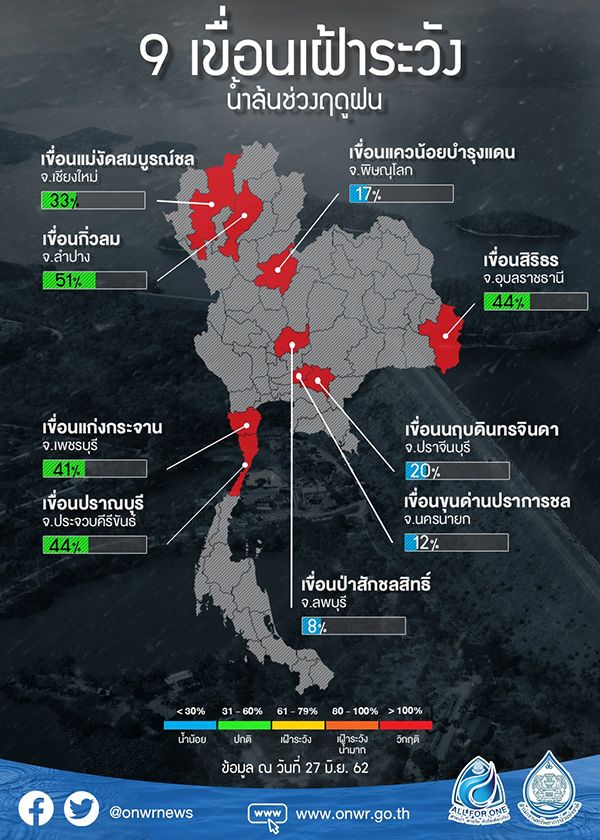 อย่างไรก็ตาม ในช่วงฤดูฝนนี้ ยังคงติดตามเฝ้าระวังสถานการณ์น้ำในอ่างเก็บน้ำที่มีปริมาตรน้ำมากกว่า 80% ของปริมาณน้ำใช้การด้วย เนื่องจากในช่วงเดือนส.ค.-ก.ย.ประเทศไทยจะกลับมามีฝนตกชุกหนาแน่นและต่อเนื่อง ที่ก่อให้เกิดสภาวะน้ำท่วมฉับพลัน น้ำป่าไหลหลาก รวมทั้งน้ำล้นตลิ่งในหลายพื้นที่ได้ โดยขณะนี้อ่างขนาดใหญ่ยังสามารถรองรับปริมาณน้ำฝนได้อีกมาก มีเพียงอ่างเก็บน้ำขนาดกลางที่มีปริมาณน้ำเกินกว่า 80% ของความจุ จำนวน 8 อ่าง แยกเป็น ภาคเหนือ 2 แห่ง ภาคตะวันออกเฉียงเหนือ 3 แห่ง ภาคตะวันอออก 2 แห่ง และภาคใต้ 1 แห่ง รวมถึง สทนช.ยังอำนวยการ กำกับ ติดตาม ให้ทุกหน่วยงาน เตรียมความพร้อมรับมือในช่วงฤดูฝนนี้อย่างต่อเนื่อง