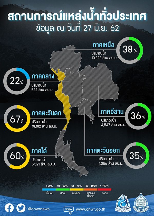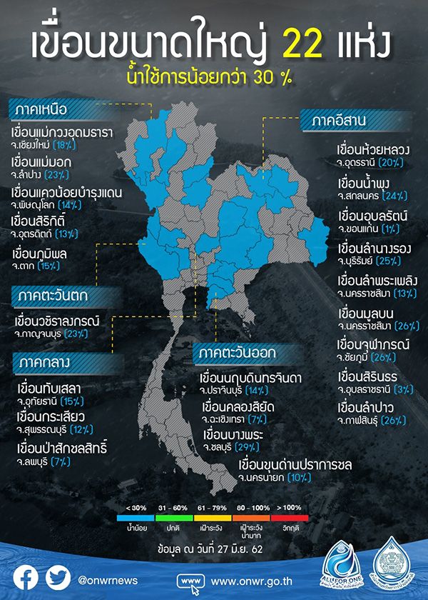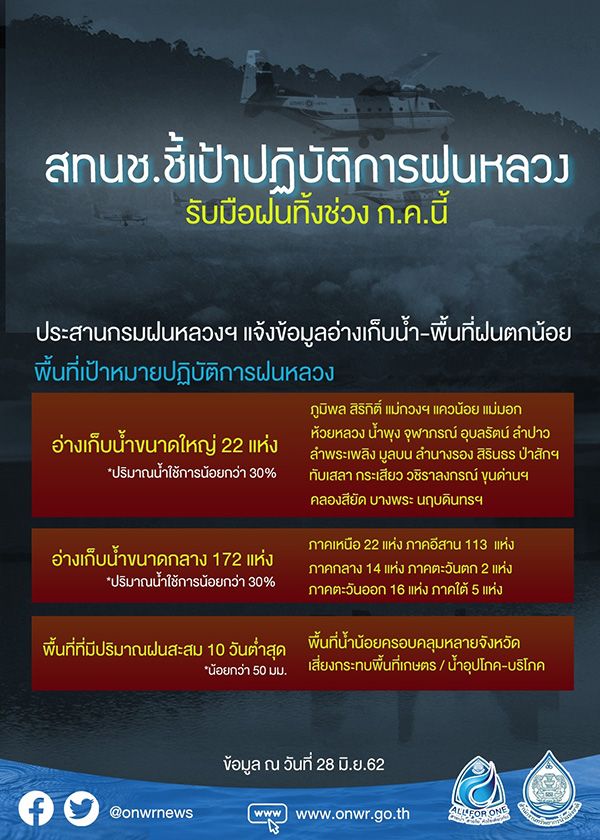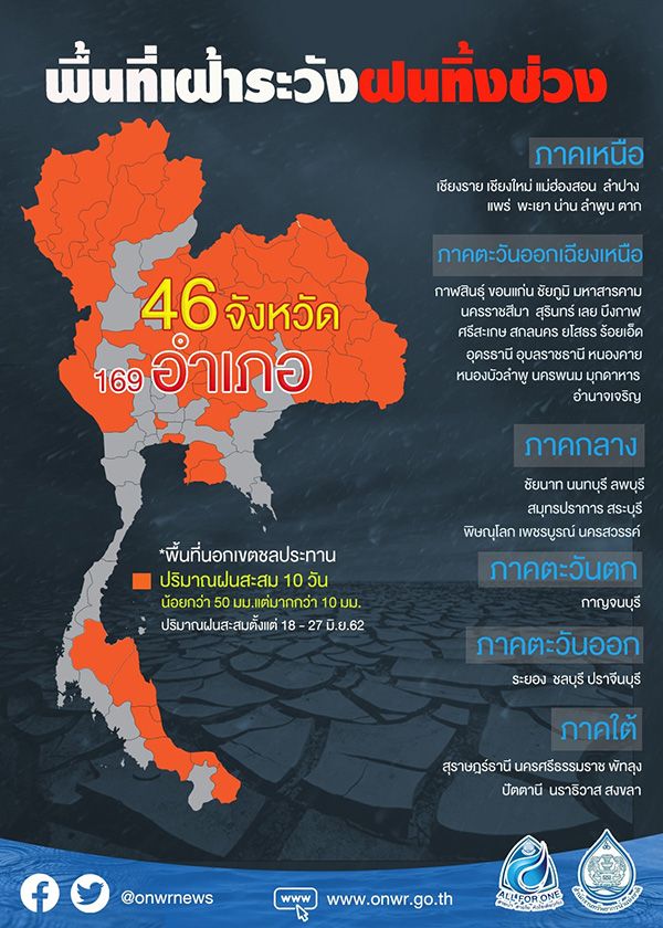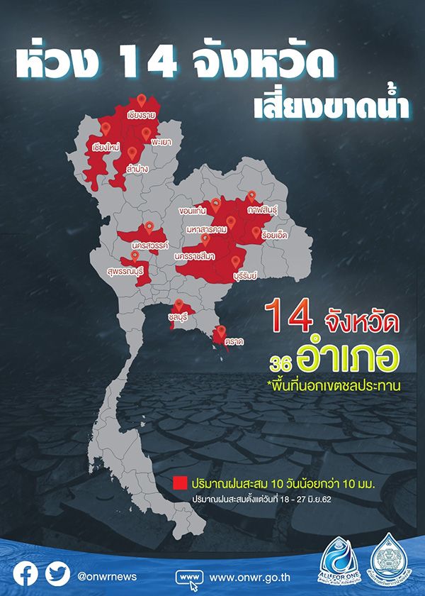 28 มิถุนายน นายสมเกียรติ ประจำวงษ์ เลขาธิการสำนักงานทรัพยากรน้ำแห่งชาติ (สทนช.) เปิดเผยว่า จากการติดตามสภาพอากาศและสถานการณ์น้ำ พบว่า แม้ว่าขณะนี้ประเทศไทยเริ่มมีฝนเพิ่มขึ้น แต่จากการวิเคราะห์ติดตามสถานการณ์ฝนสะสม 10 วัน ที่ผ่านมา มีพื้นที่ปริมาณฝนสะสมน้อยกว่า 10 มิลลิเมตร (มม.) เป็นพื้นที่นอกเขตชลประทาน และไม่มีแหล่งน้ำต้นทุนสำรอง ที่อาจจะมีความเสี่ยงที่จะขาดแคลนน้ำอุปโภคบริโภค และพื้นที่เกษตรอาจได้รับความเสียหายได้ จำนวน 14 จังหวัด 36 อำเภอ อาทิ จ. เชียงใหม่ สุพรรณบุรี นครราชสีมา ชลบุรี โดยมีถึง 3 อำเภอ ใน 3 จังหวัดไม่มีฝนตกเลยติดต่อกัน 10 วัน ได้แก่ อ.เชียงแสน จ.เชียงราย อ.สีชัง จ.ชลบุรี และอ.คลองใหญ่ จ.ตราด ขณะเดียวกัน สทนช.ยังได้ได้วิเคราะห์พื้นที่ปริมาณฝนสะสมน้อยกว่า 50 มม.โดยกำหนดเป็นพื้นที่เฝ้าระวังนอกเขตชลประทาน จำนวน 46 จังหวัด 169 อำเภอ อาทิ จ. เชียงใหม่ ขอนแก่น นครศรีธรรมราช ชลบุรี เป็นต้น