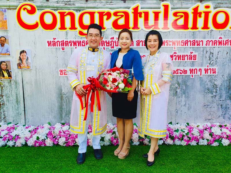 nn ยุวดี จึงเจริญ ผู้จัดการอาวุโส บริษัท โมโน แอสโทร จำกัด ในเครือ โมโนกรุ๊ป มอบช่อดอกไม้ร่วมแสดงความยินดีกับ นายเขมชาติ ปริญญานุสรณ์ หรือ อ.คฑา ชินบัญชร ในโอกาสที่สำเร็จการศึกษาระดับปริญญาเอก สาขาวิชาพุทธศาสตร์และเข้ารับพระราชทานปริญญาบัตรจากสมเด็จพระอริยวงศาคตญาณ สมเด็จพระสังฆราชสกลมหาสังฆปริณายก ณ หอประชุม มวก. 48 พรรษา มหาวิทยาลัยจุฬาลงกรณ์ราชวิทยาลัย จ.พระนครศรีอยุธยา