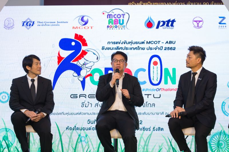 บมจ. อสมท ร่วมกับ บมจ.ปตท. และพันธมิตร จัดงานแถลงข่าว “การแข่งขันหุ่นยนต์ MCOT – ABU ชิงชนะเลิศประเทศไทย ประจำปี 2562” เพื่อเฟ้นหาเยาวชนเป็นตัวแทนประเทศไทย เข้าร่วมแข่งขัน ABU Robocon2019 Ulaanbaatar ที่ประเทศมองโกเลีย โดยมีนายเขมทัตต์ พลเดช กรรมการผู้อำนวยการใหญ่ บมจ.อสมท, ศ.ดร.มนูกิจ พานิชกุล ประธานคณะกรรมการวิชาการการแข่งขันฯ , ดร.พิชัยรัตน์ จิรานันรัตน์ ผู้อำนวยการโครงการโรโบติกส์ เอไอ แอนด์ อินเทลลิเจนท์ โซลูชั่น บริษัท ปตท. จำกัด (มหาชน) และคุณสมหวัง บุญรักษ์เจริญ ผอ.สถาบันไทย-เยอรมัน ร่วมงานแถลงข่าว ณ อาคารอำนวยการ 1 บมจ.อสมท
