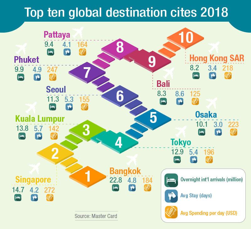 Two other Thai destinations – Phuket and Pattaya – also made the Asia Pacific Top 10 for international arrivals, coming in at seventh and eighth, with 9.9 million and 9.4 million visitors, respectively.