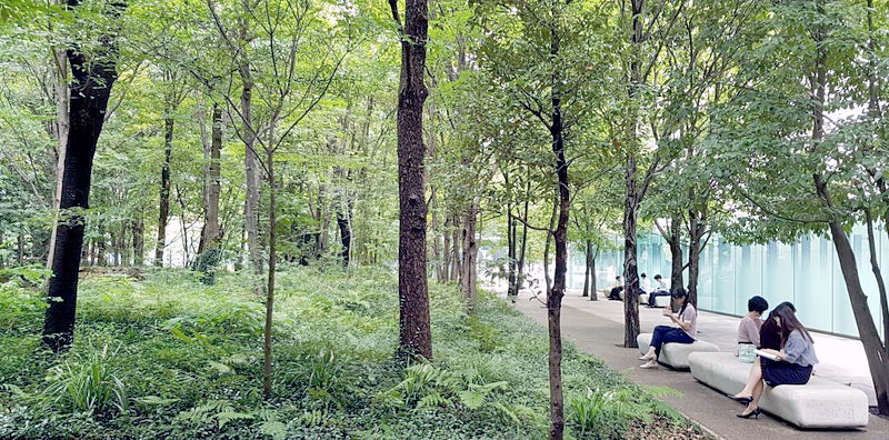 Our first stop on the Tokyo leg of the visit is Mitsubishi Estate’s headquarters in Otemachi next door to Marunouchi where Takanori Murakami, deputy general manager of the company’s Urban Development Promotion Department, is on hand to explain in detail how a green environment including a man-made forest has been incorporated within the concrete skyscrapers in the Otemachi, Marunouchi and Yurakucho areas. He tells us about the short-term initiatives the company wants to accomplish in 2020 and its long-term plans it aims to complete by 2050 before we are heading to a site visit around the area where the small forest surrounding the Cafe by Aman. This is a popular spot among salaryman, a place to eat their lunch and take a break from the concrete jungle.