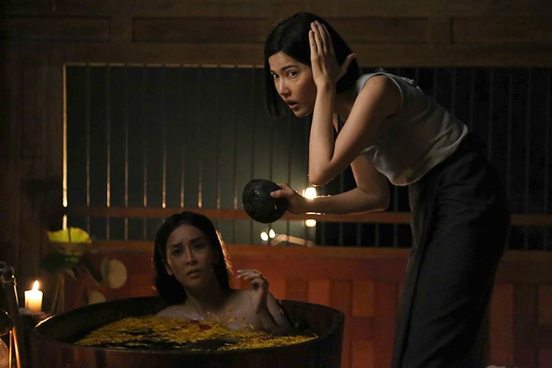 สำหรับซีนอาบน้ำที่เป็นซีนขายและเป็นซีนที่ยากอันดับต้นๆ ของละครเรื่องนี้เลยก็ว่าได้ ต้องบอกว่าฉากอาบน้ำนี้จัดเซตขึ้นมาใหม่ทั้งหมด รวมถึงการจัดแสงที่ต้องทำให้ดูขลัง!!! มีการเล่นมนต์คาถา งานนี้ “สาวใหม่” เริ่มจากการทำเอฟเฟกต์หน้าให้ดูแก่ เนื่องจากอาบน้ำแสงจันทร์ช้ากว่ากำหนด หน้าจึงเริ่มมีการริ้วรอย เหี่ยวย่น ใหม่เริ่มพิธีสวดมนต์คาถาพร้อมถอดผ้าถุงออก เห็นเรือนร่าง งานนี้สาวใหม่จัดเต็มใส่เซฟป้องกันทั้งบนและล่าง ยอมถ่ายเองโดยไม่ใช่สแตนด์อิน ท่ามกลางอากาศเย็นในยามกลางคืน แถมยังต้องลงน้ำอีก งานนี้สั่นแค่ไหนใหม่ก็บอกว่าสู้ตาย และในระหว่างที่ทำพิธีใหม่ไม่รู้เลยว่าน้ำหวานกำลังแอบมอง และเมื่อสบจังหวะน้ำหวานก็เข้ามากระชากกะลาตาเดียวจากมือใหม่ และเอากะลาฟาดใส่หน้าหลายครั้งจนใหม่สู้ไม่ไหวนอนหมดสติอยู่นอกอ่าง เรียกว่าเป็นคิวบู๊ของสาวๆ ที่โหดไม่น้อย เพราะใหม่ต้องอยู่ในอ่าง ด้วยท่วงท่าที่ยาก จึงทำให้คัทฟาดด้วยกะลาถ่ายทำกันอยู่หลายเทค น้ำหวานที่แอบมีเกร็งๆ กลัวผิดคิวฟาดโดยหัวใหม่จริงๆ ก็ออกปากขอโทษขอโพยใหม่อยู่หลายรอบ กว่าจะผ่านซีนนี้ไปได้ก็จัดเต็มล่วงเลยคิวก็จนเที่ยงคืนไปเลยจ้า
