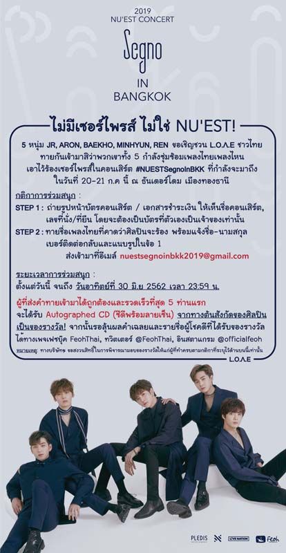 ยังมีเวลาร่วมสนุกกันได้จนถึงวันที่ 30 มิถุนายน 2562 นี้ ติดตามรายละเอียดกติกาต่างๆ เพิ่มเติมได้ทางออฟฟิเชียลแฟนเพจของผู้จัดงาน บริษัท เฟโอห์ จำกัด https://www.facebook.com/FeohThai หรือทวิตเตอร์ @FeohThai และอินสตาแกรม FeohThai (@officialfeoh) https://www.instagram.com/officialfeoh/ กิจกรรมนี้สำหรับผู้จองบัตรคอนเสิร์ต “2019 นิวอีสต์ คอนเสิร์ต <เซ-นโย> อิน แบงคอก” (2019 NU’EST CONCERT <Segno> IN BANGKOK) เรียบร้อยแล้วเท่านั้น… ใครยังไม่มีบัตร แนะนำว่ารีบจัดหากันโดยด่วน ณ จุดจำหน่าย “ไทยทิคเก็ตเมเจอร์” ทุกสาขา หรือจองผ่าน TTM Call Center โทร.02-262-3456 และระบบออนไลน์ทาง https://www.thaiticketmajor.com/concert/nuest-concert-segno-in-bangkok-2019.html บัตรราคา 2,500 / 3,500 / 4,500 / 5,500 นั่ง / 5,500 ยืน และ 6,000 บาท (บางราคาจำหน่ายหมดแล้ว)