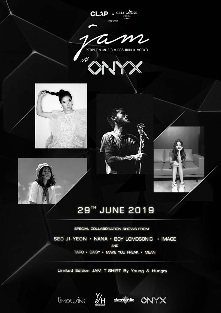 วันเสาร์ที่ 29 มิถุนายน 2562 nn CLAP จับมือร่วมกับ GREYGOOSE จัดปาตี้ JAM คลับปาร์ตี้ที่มีคอนเซ็ปต์จากการรวมเอาความน่าสนใจของ Lifestyle ในหลายๆ มุม อาทิแฟชั่น ดนตรี สังคม และเครื่องดื่ม มารวมเข้าด้วยกัน โดย JAM แต่ละครั้งจะมีศิลปินต่างๆ มาร่วม JAM เพลง กับ DJ ซึ่งเป็นโชว์พิเศษที่ไม่เคยเห็นที่ไหนมาก่อน และในครั้งนี้พิเศษสุด กับปาร์ตี้ JAM ที่กำลังจะเกิดขึ้น พบกับโชว์จาก ซอง จียอน, นานา, อิมเมจ และ บอย LOMOSONIC, Taro DaisyMake you freak และ DJ Mean ในแสงสีเสียงสุดอลังการ..ห้ามพลาด!! กับ ความมันส์ ความสนุกแบบจัดเต็มกำลังจะเกิดขึ้น ที่ ออนิก(ONYX) คลับระดับโลกทีเดียวในกรุงเทพฯ นอกจากนี้ ผู้เข้าร่วมงานอาจมีสิทธิ์ได้เสื้อยืด Limited Edition ที่ทาง JAM ทำร่วมกับ street brand อย่าง young & hungry สอบถามข้อมูลเพิ่มเติม 08-16451166 หรือ http://www.facebook.com/onyxbkk