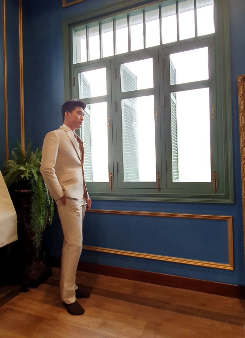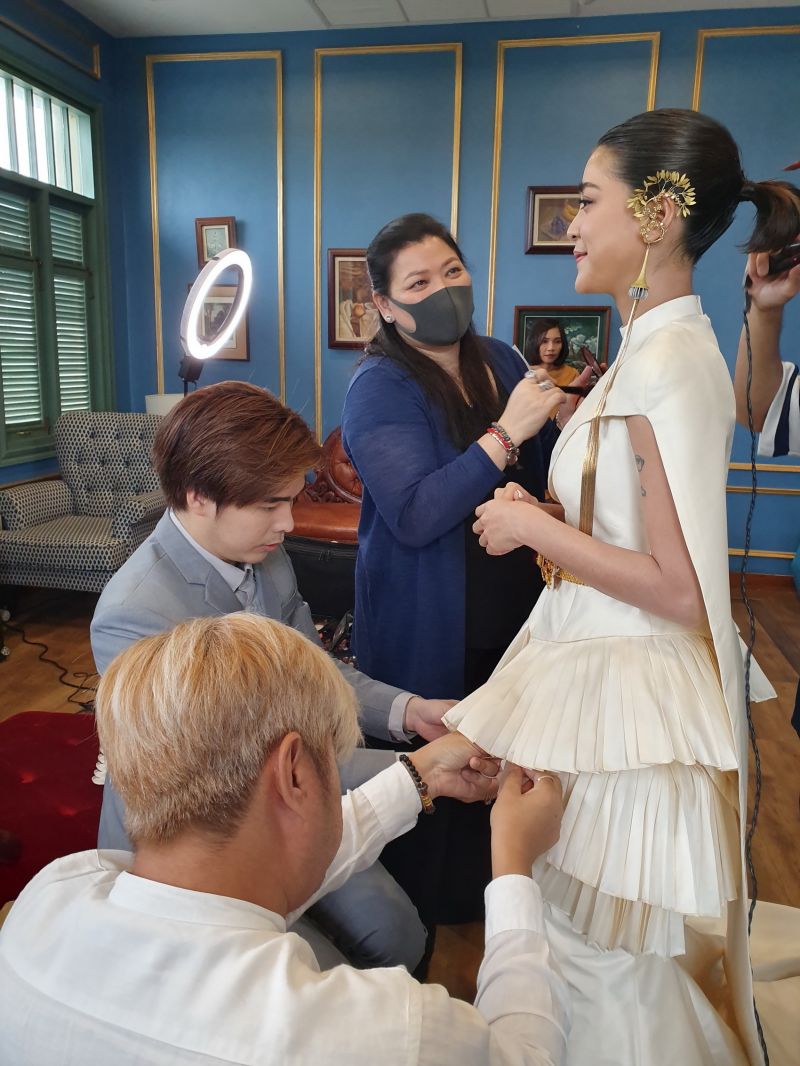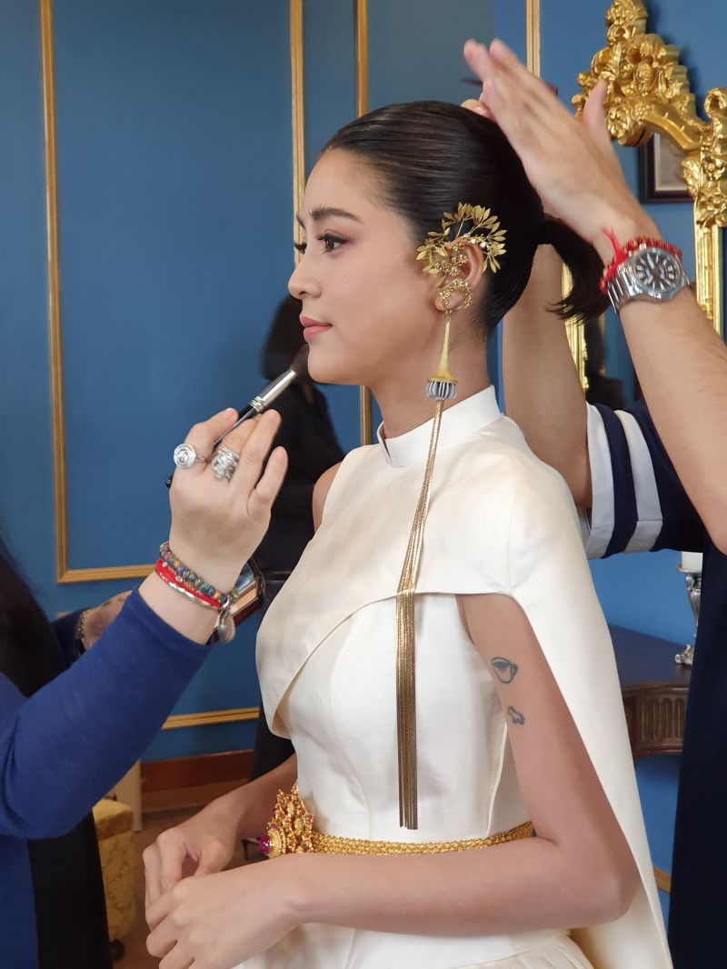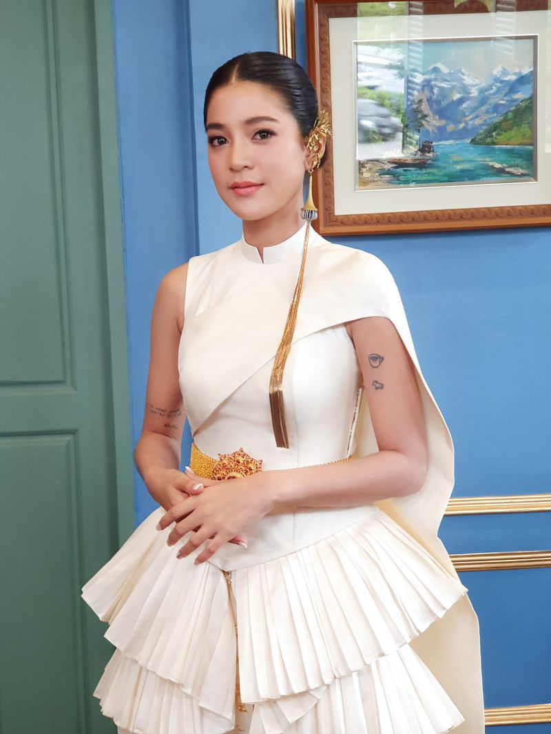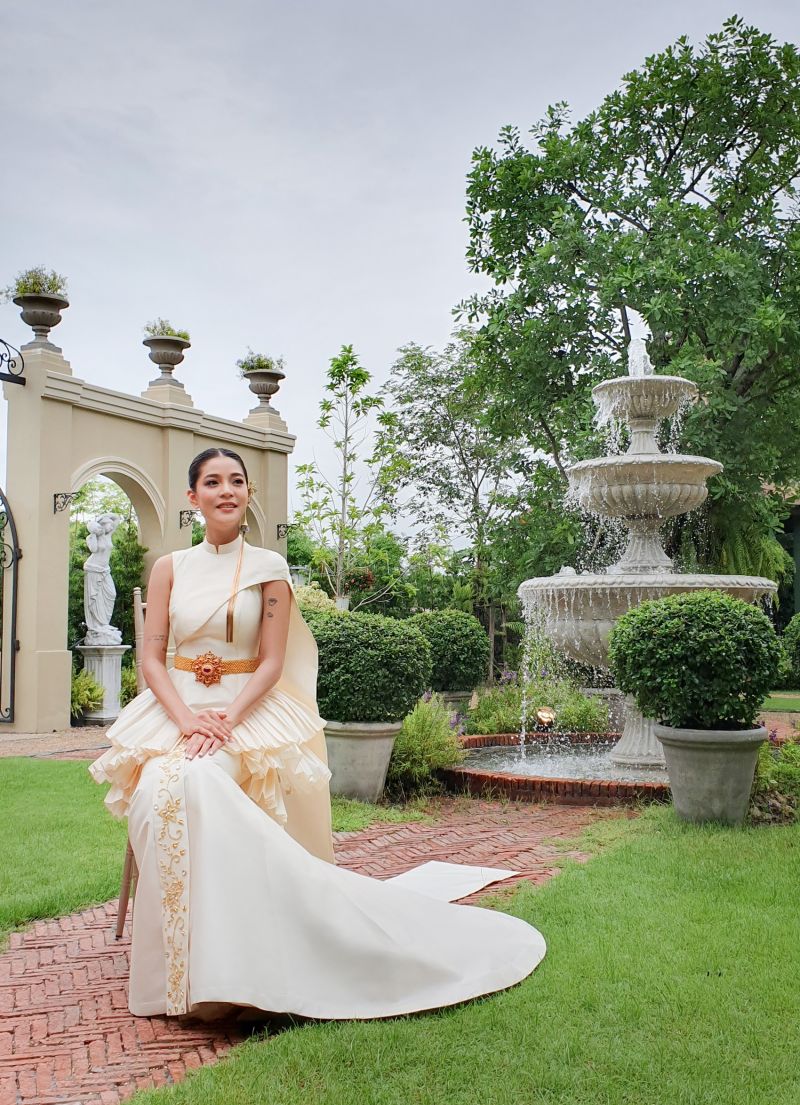 โดยจับความเป็นไทยและจีนมาไว้ด้วยกันชุดแต่งงานเป็นรูปแบบแนวร่วมสมัย ช่วงบนของชุดถูกดีไซน์เป็นลักษณะคอจีน ส่วนกระโปรงเป็นแบบหางปลามีชายลากยาว ความเก๋อยู่ที่สไบด้านหลังที่สามารถถอดได้เพื่อให้กลายเป็นชุดกี่เพ้าในช่วงยกน้ำชาได้ด้วยปกติชุดไทยของทางร้านจะเน้นงานปักโดยส่วนใหญ่ แต่ชุดนี้แทบจะมีงานปักน้อยมากจะมีก็แค่บริเวณหน้านางที่ตัวกระโปรงมีการปักลวดลายเพื่อเพิ่มมิติให้ชุดดูสวยงามเท่านั้นทั้งนี้ก็เพื่อให้เหมาะกับสไตล์ของเจ้าสาวนั่นเอง ตัวชุดเป็นสีดอกจำปีซึ่งเป็นสีมงคลหมายถึงความร่ำรวยและเงินทอง