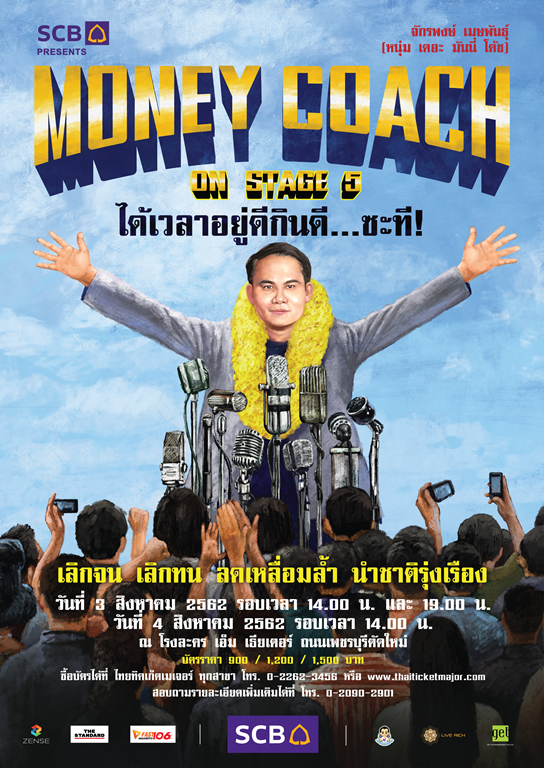 SCB Presents Money Coach On Stage 5 (เอสซีบี พรีเซนต์ มันนี่โค้ช ออน สเตจ 5) “ได้เวลาอยู่ดีกินดี…ซะที!ทอล์คโชว์ทางการเงิน ที่เหมาะกับคนทุกเพศทุกวัยในสังคม และไม่ใช่เงินหรอกที่แก้ปัญหาเรื่องเงิน ความรู้ทางการเงินที่จะแก้ปัญหาจะจัดขึ้นทั้งหมด 3 รอบ ในวันเสาร์ที่ 3 สิงหาคม และวันอาทิตย์ที่ 4 สิงหาคม (วันที่ 3 ส.ค.รอบ 14.00 น. และ 19.00 น. และวันที่ 4 ส.ค.รอบ 14.00 น.)ณ โรงละคร เอ็ม เธียเตอร์ ถนนเพชรบุรีตัดใหม่ บัตรราคา 900 , 1,200 , 1,500 บาท ซื้อบัตรได้ที่ไทยทิคเก็ตเมเจอร์ ทุกสาขา โทร. 0-2262-3456 ติดตามเคลื่อนไหวได้ทาง FB :TheMoneyCoachTH
