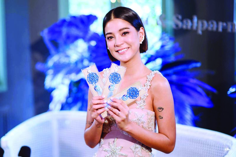 สายป่าน “ของป่านมีทั้งหมด 5 ชุดค่ะเมื่อเช้าใช้ไป 2 ชุด ชุดแถลง 1 ชุด ตอนเย็นมีชุดงานอีก 1 ชุด และชุดอาฟเตอร์ปาร์ตี้อีก 1 ชุดค่ะ ชุดแถลงข่าวนี้ก็มีพี่ดีไซเนอร์ออกแบบให้ เพราะเขารู้ว่าเราชอบดำน้ำมาก ก็จะมีพวกน้องหอย น้องปู น้องปลามาอยู่บชุดเยอะเลย ป่านก็บอกกับพี่เขาไปว่าอยากได้โทนสีแนวทะเลกำลังโดนมรสุม (หัวเราะ)เป็นสีเย็นๆ ฟ้าๆ สีเขียวน้ำทะเล คือทะเลมรสุมถ้าได้อยู่กับคนที่เรารัก แล้วทะเลมรสุมก็คือน้ำที่อยู่บนพื้นกับน้ำที่อยู่บนฟ้ามันมาเจอกัน”