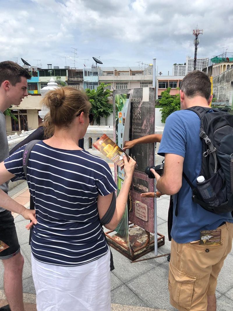มีไกด์พานักท่องเที่ยวมา 4คน ตามรูป ก็แอบฟัง เขาอธิบาย ประวัติของวิหาร และมีซีนนึง เขาต้องเอามือแหวก ความเป็นมาจากป้าย ที่เก่าจาง ซีด และถูกบังไปแล้ว จากแผ่นป้ายโฆษณาของน้ำชาไข่มุก
