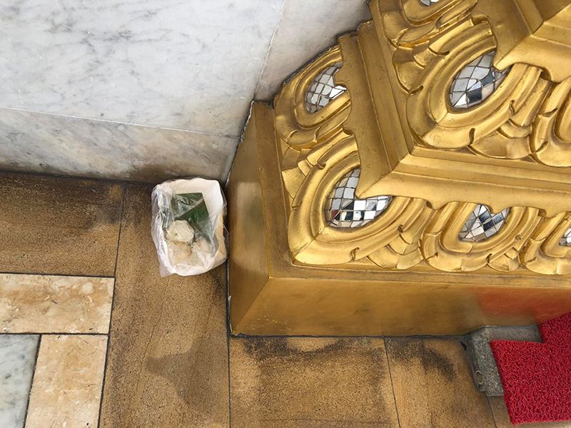 ภายในวิหาร อ่อ ก่อนเข้าประตู ยังไม่วายพบถาดขนม น่าจะขนมครก วางตรงข้างทางเข้าเลย ขยะจะอยู่ทุกซอกทุกมุมจริงๆ ขวดน้ำก็วาง ดูภาพประกอบเอานะ