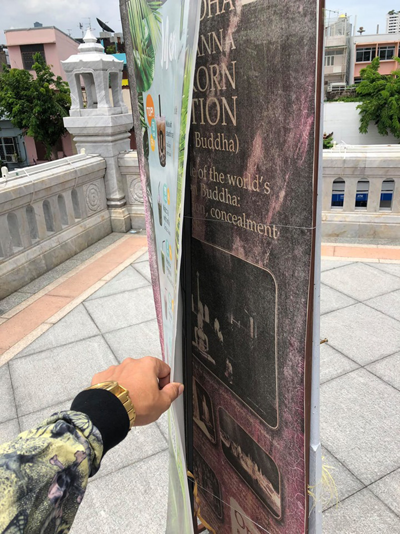 เมื่อวันที่ 13 กรกฎาคม ‘พล่ากุ้ง’ ดีเจและพิธีกรชื่อดังโพสต์ภาพและข้อมูลมีเนื้อหาโดยสรุปวิพากษ์วิจารณ์วัดแห่งหนึ่งซึ่งปล่อยให้มีการนำป้ายเมนูเครื่องดื่มปิดทับป้ายประวัติวิหาร ส่งผลให้นักท่องเที่ยวที่ต้องการทราบประวัติความเป็นมาต้องแหวกป้ายดังกล่าวเพื่ออ่านซึ่งเป็นสิ่งที่ไม่เหมาะสม